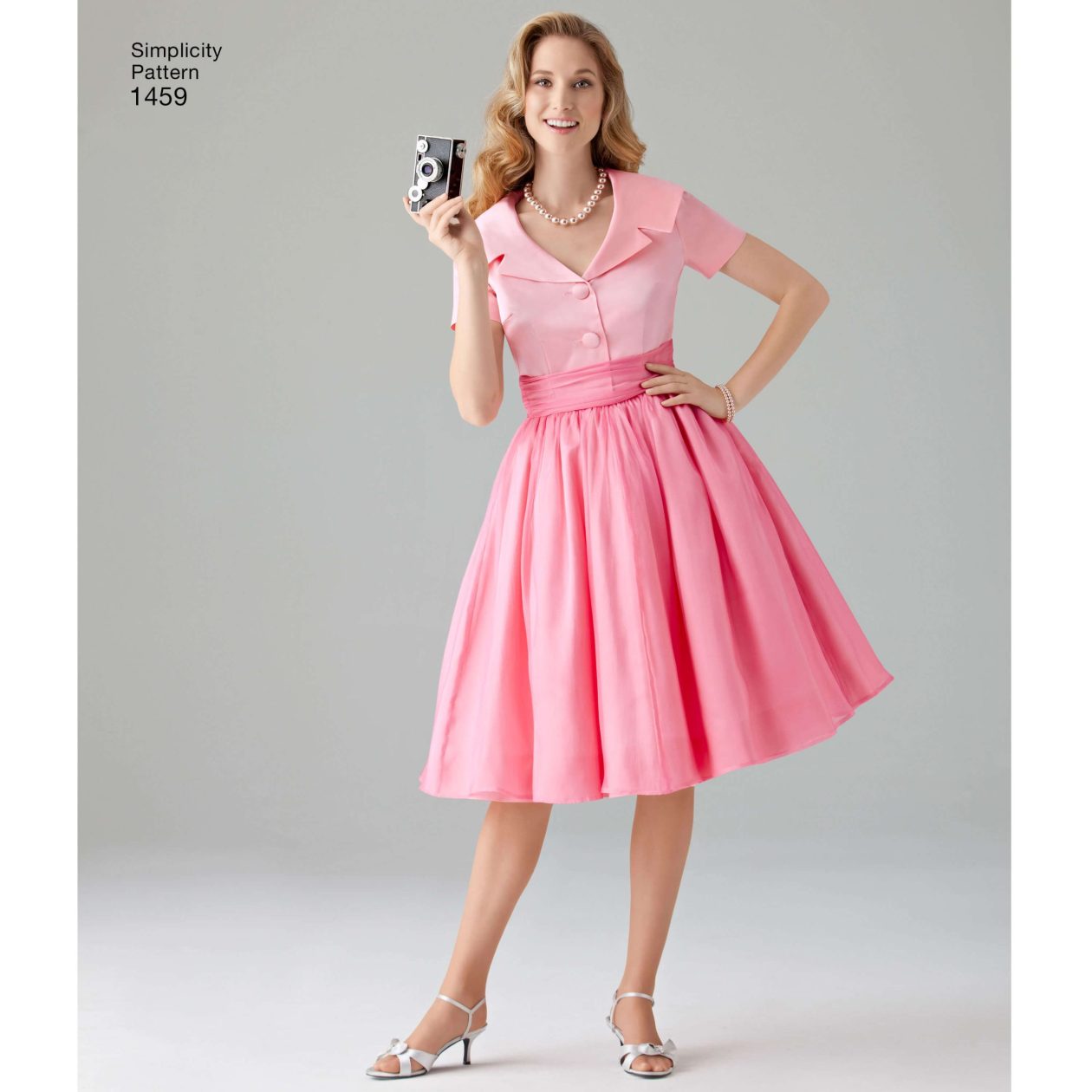 Make this beautiful pullover dress and you’ll feel like you’re living in the 1950s! This design features a collar, optional shoulder pads, a fitted bodice, cute pockets with ties, a side zipper and self belt.