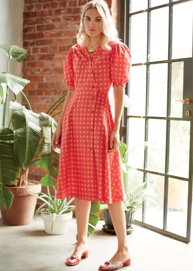 These puffed sleeves with cute little frills equals perfection! This dress is chic and playful and we love it. The fitted bodice has darts, a back zip fastening and a waist seam. Go for the optional frill on the flared skirt and neckline to add even more cute details.