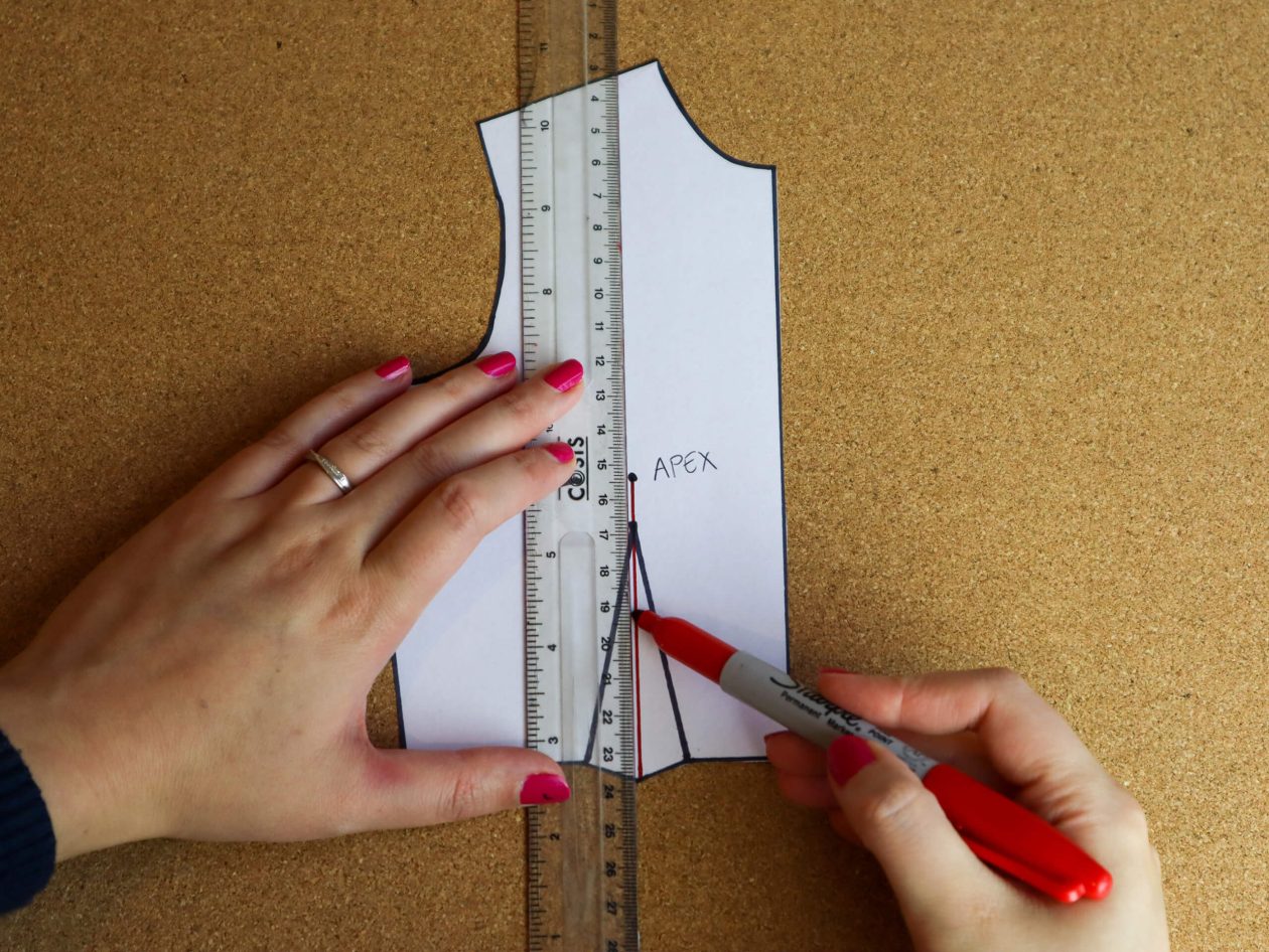 Step 2: Draw a line through the centre of the bust dart to the apex point.
