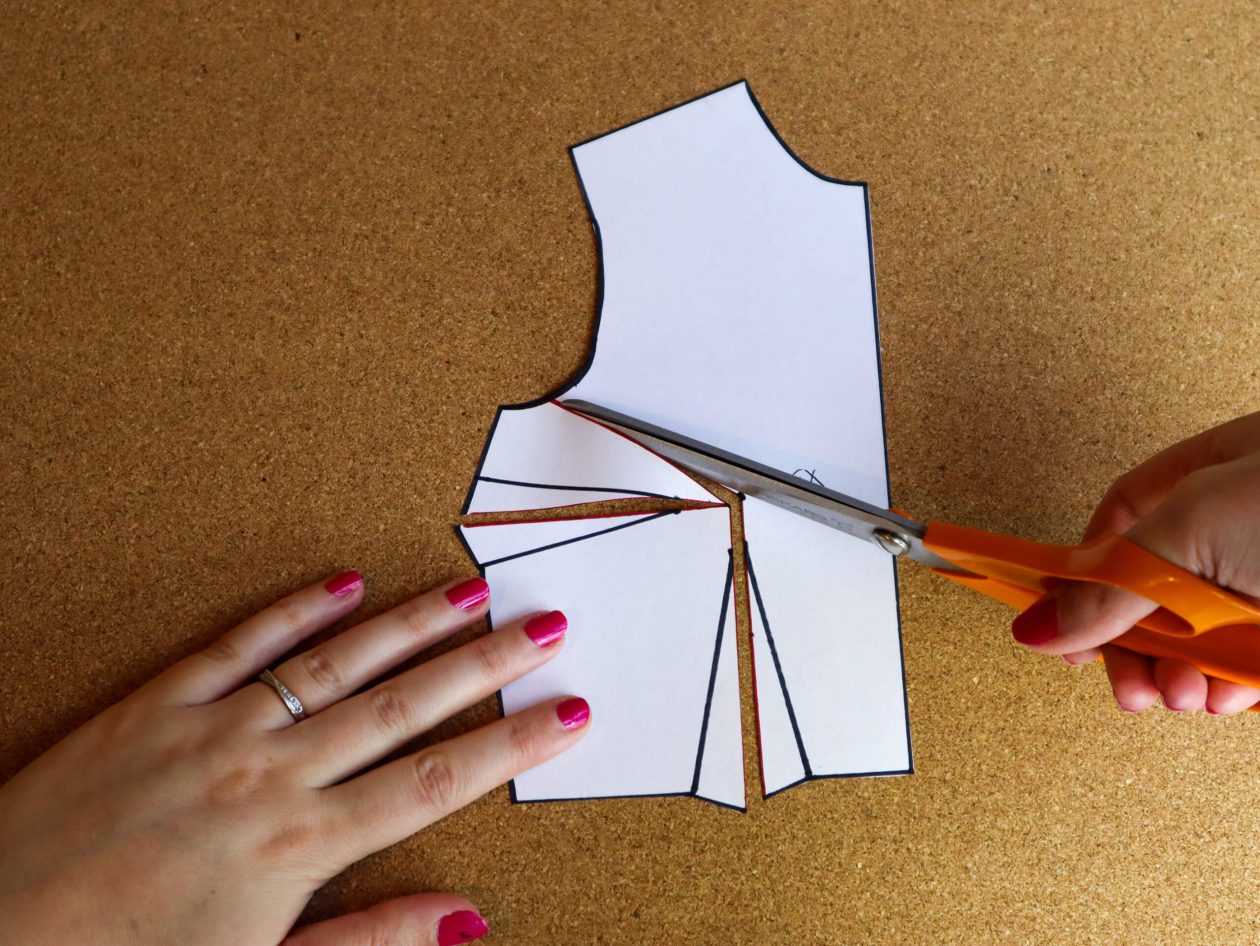 Step 4: Cut along the lines, leaving the paper connected at the armhole and the end of the bust dart as shown. You’re making two little hinges of paper.