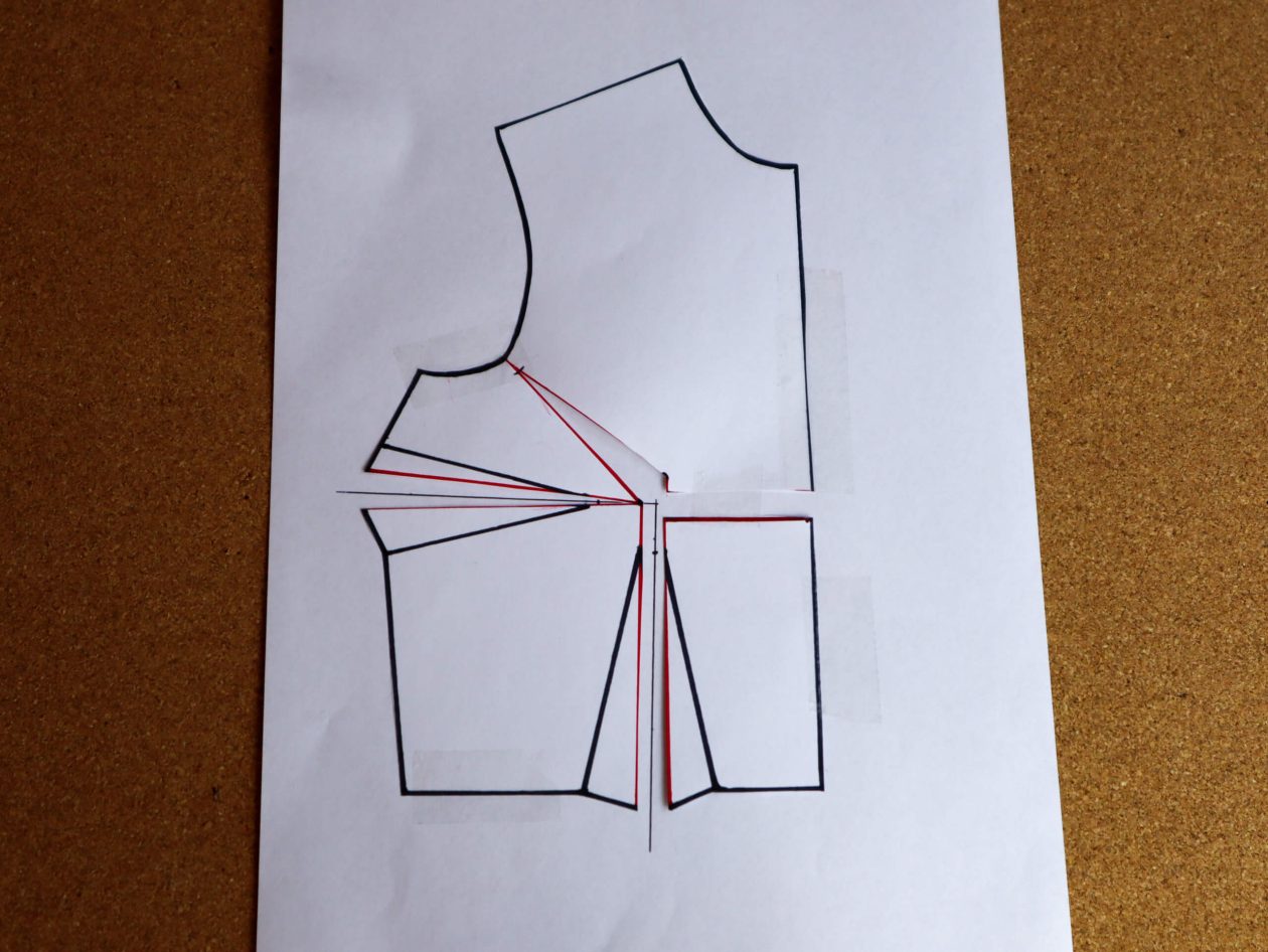 Step 8: Measure 1″ down each line away from the apex. Mark each point and redraw the dart legs for the bust and waist darts. Then close the gap in the centre front edge.