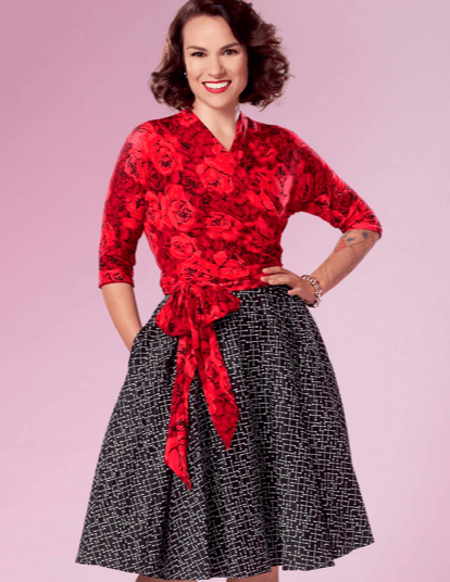 This cardigan-style wrap top, is part of our Indie Sewing Pattern collaboration with Gertie. It’s sized for stretch knits only and fastens at side front with long waist ties. Easy to sew and suitable for construction using an overlocker or serger. And it includes a skirt pattern in the envelope as well!