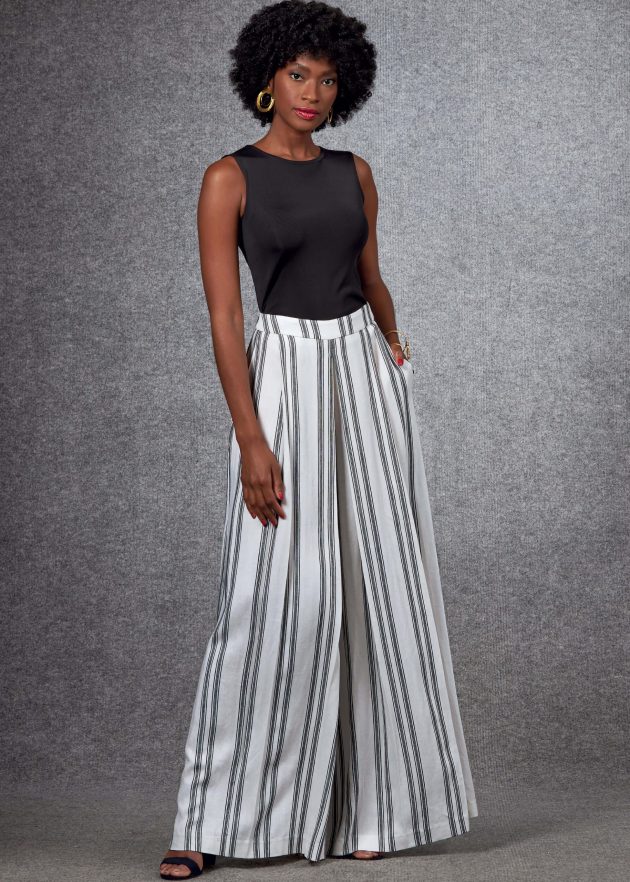 These wide legged trousers are fab-u-lous! Vogue 1685 comes in two length variations, so you can wear this pattern all year round. The design features two front pleats, side pockets, a back zip and a waistband.