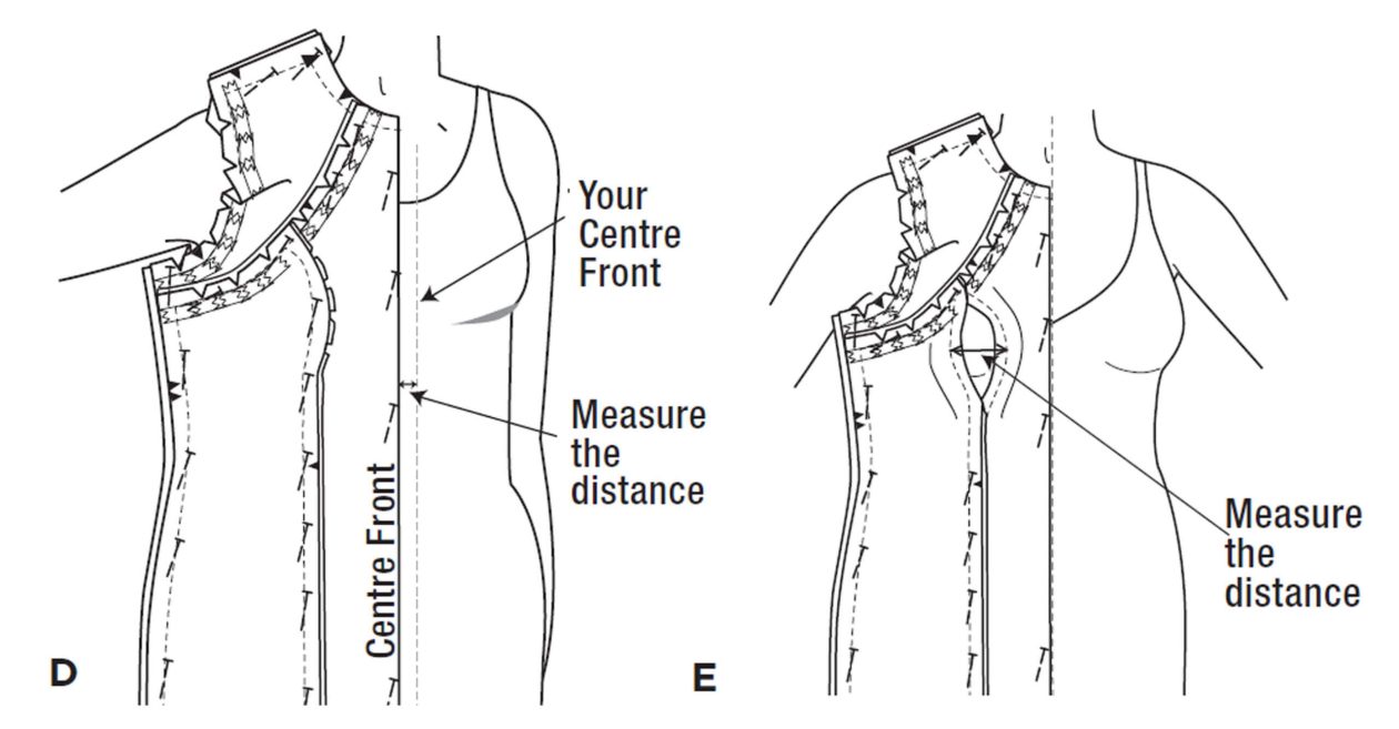 - Pin the centre back to your centre back. Does the centre front of the tissue meet the centre front of your body? (D). If not, unpin the seam over the bust until you can pin the centre front to your centre front.