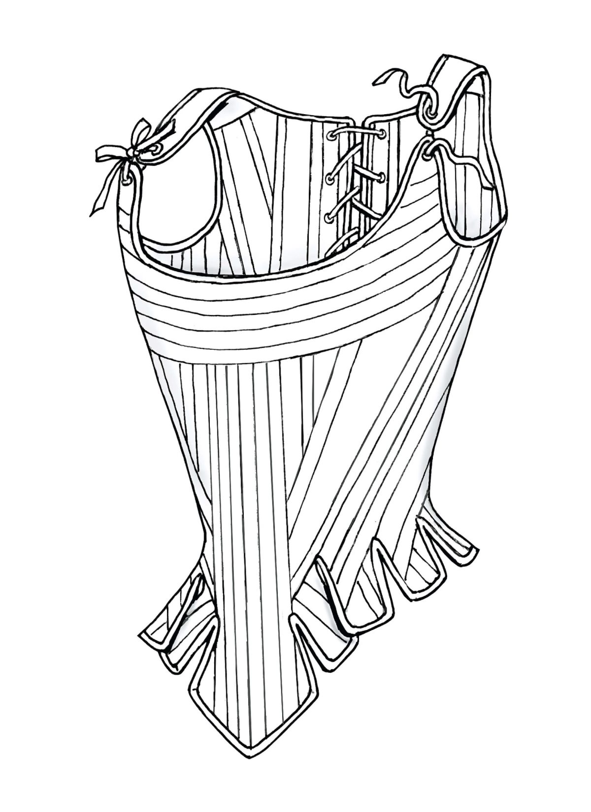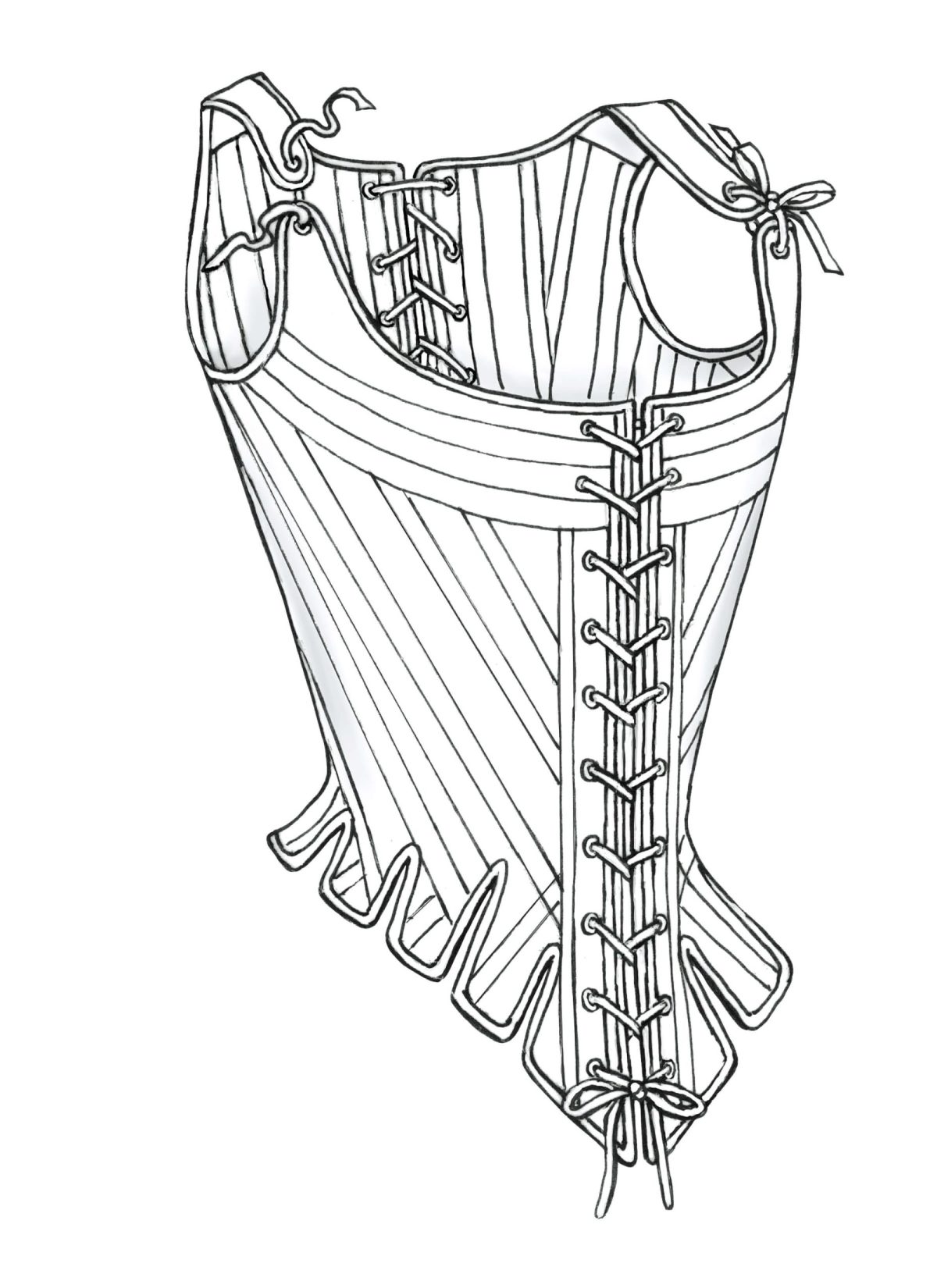 Lined, close-fitting, stays/corset has extensive boning and purchased or self made eyelets for lacing and fit adjustment. D: Purchased trim.