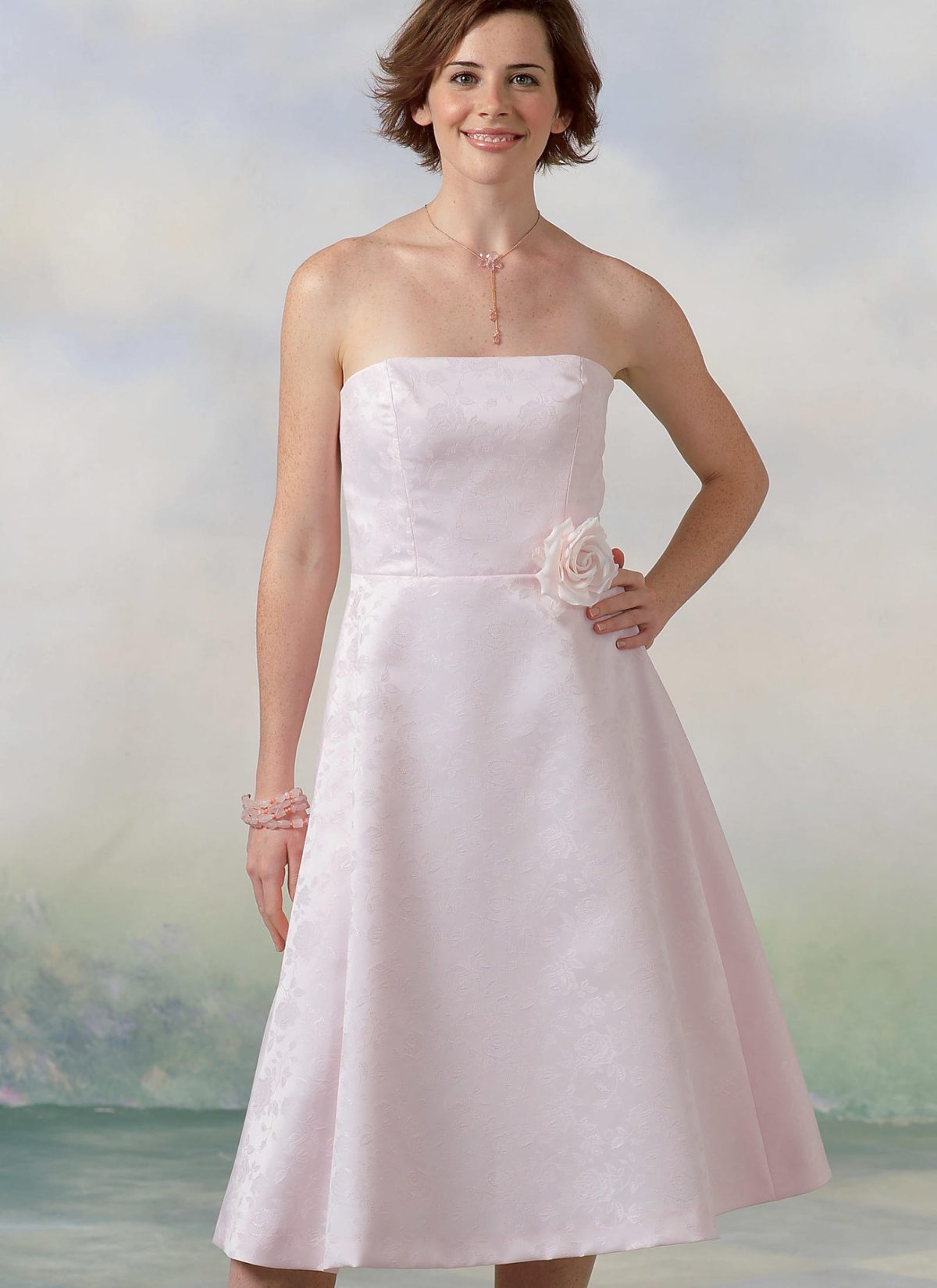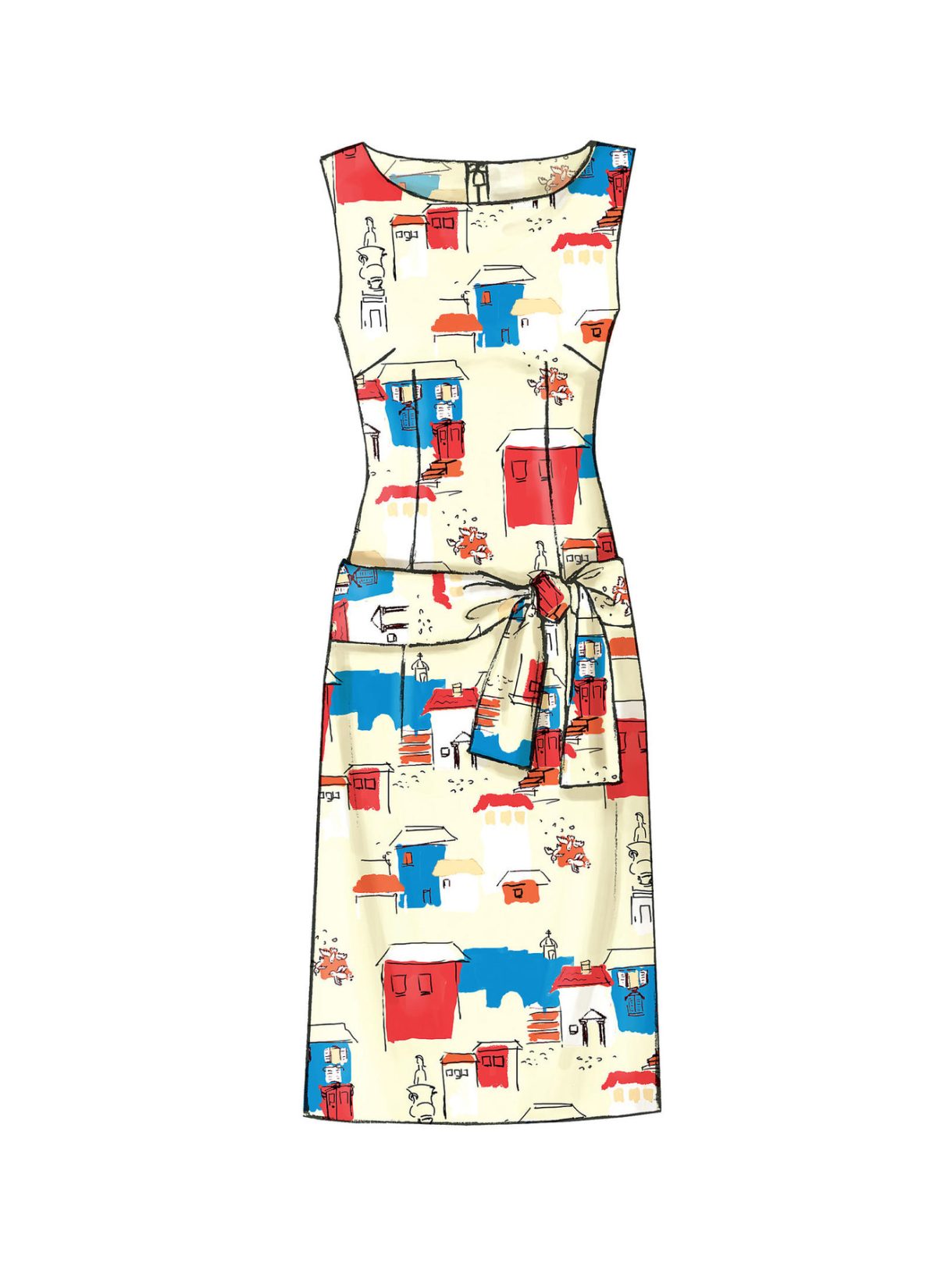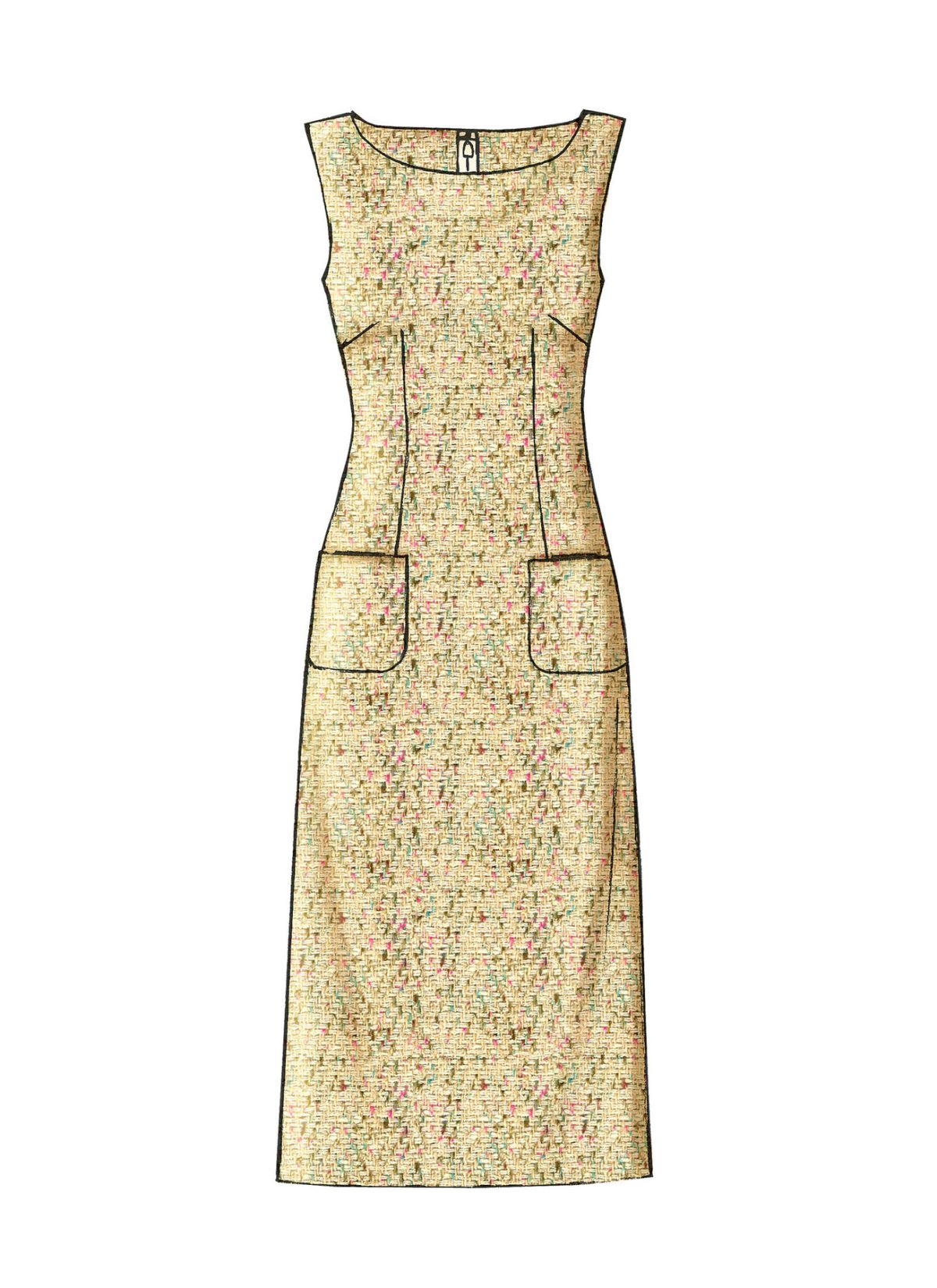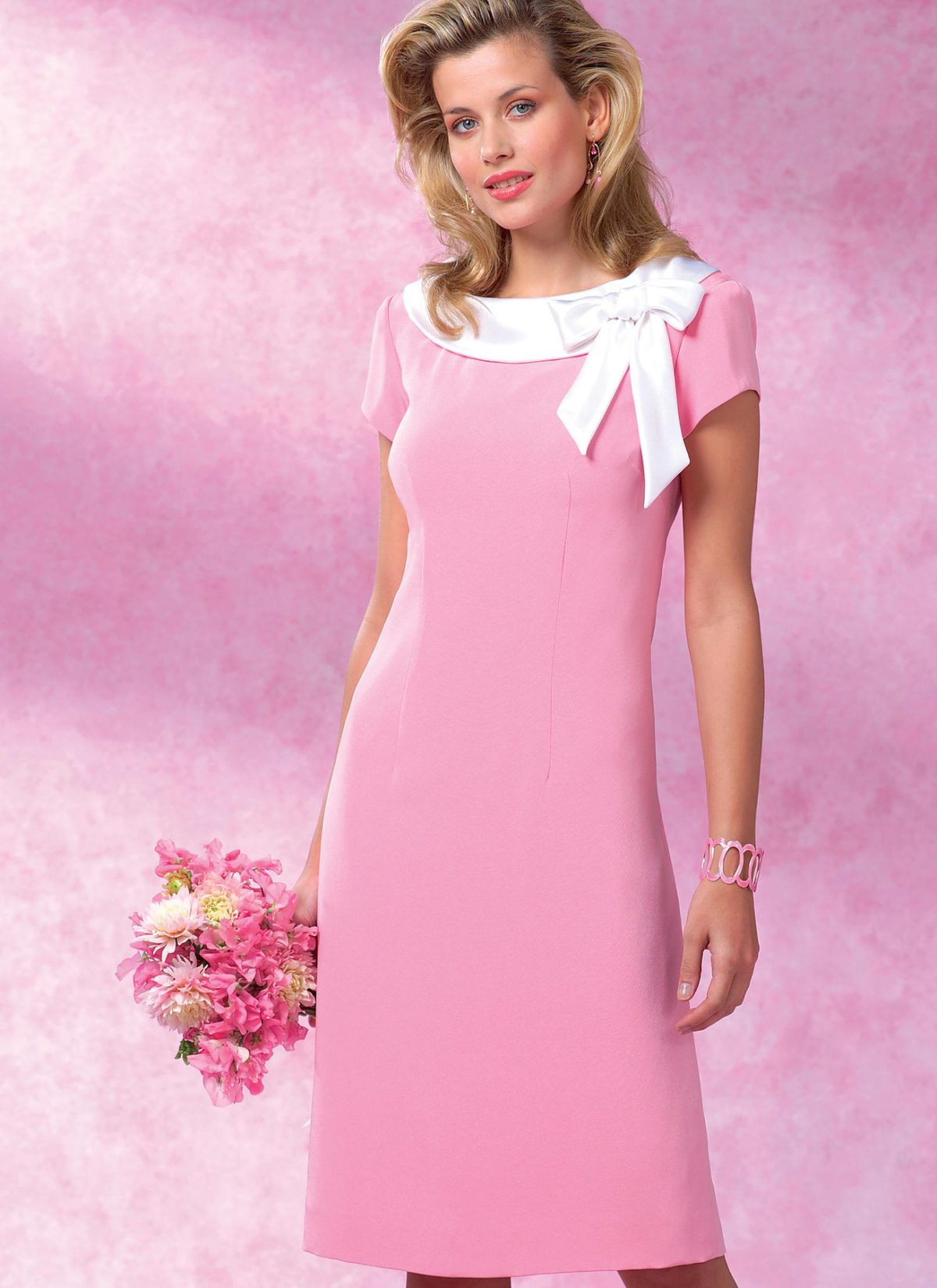 Semi-fitted, straight sheath dress in various lengths has back zipper closure and back seam slit. A: Self-bands. A, D: Sleeveless. B: Contrast collar and bow. B, E: Cap sleeves. C: Three-quarter length sleeves and self-sash. D: Patch pockets. F: Long sleeves and front drape.