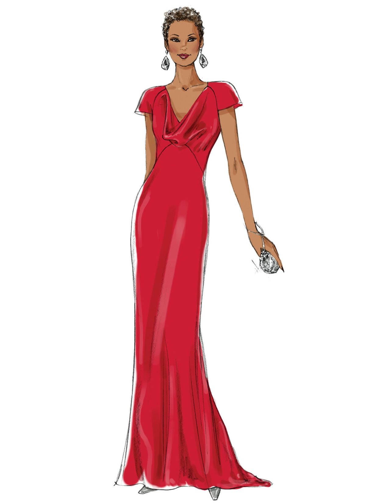 Close fitting, lined, bias wedding or event dress has front self-faced drape over front bodice, cap sleeves, shaped waistline and back invisible zipper. B, C: Slight train. C: Purchased trim.
