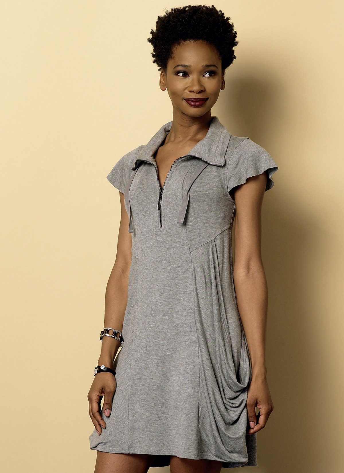 Pullover dress (fitted through bust) has stand-up collar, yokes, side-front seams, draped pockets, exposed front zipper, stitched hems, and topstitching. A: Double collar, outer collar, cap sleeves, raw edge finish and purchased drawstring for inner collar. B: Contrast yoke. B, C: Long sleeves.