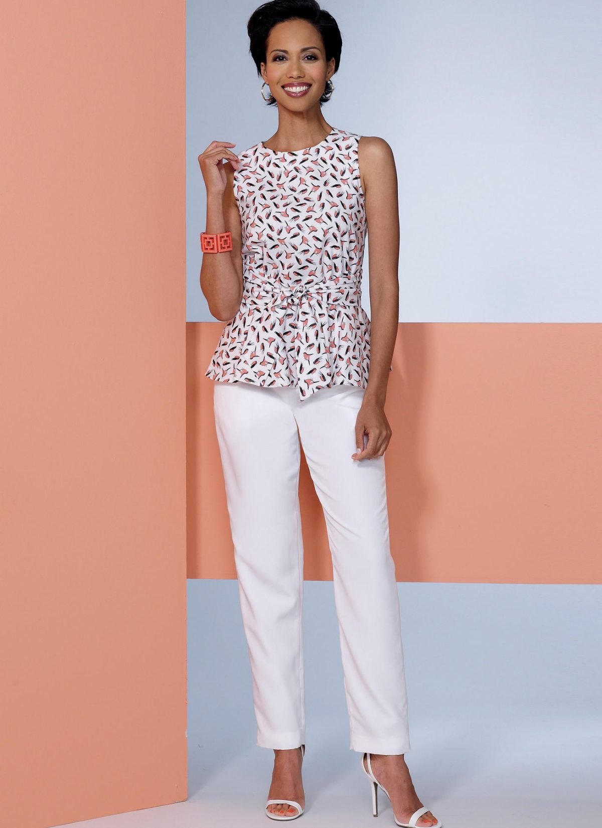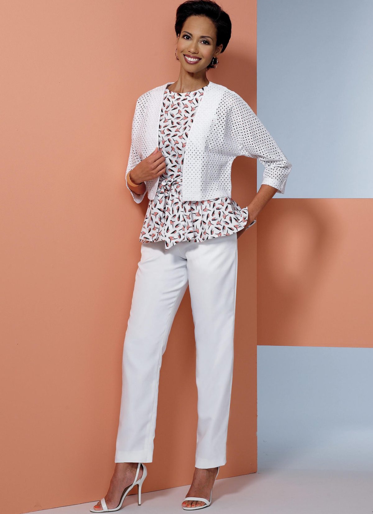 Loose-fitting unlined jacket has dolman sleeves. Close-fitting dress and top have back zipper and waist inset with tie ends. Semi-fitted skirt and Trousers have front and back yoke, and back zipper. Wardrobe booster pattern pack.