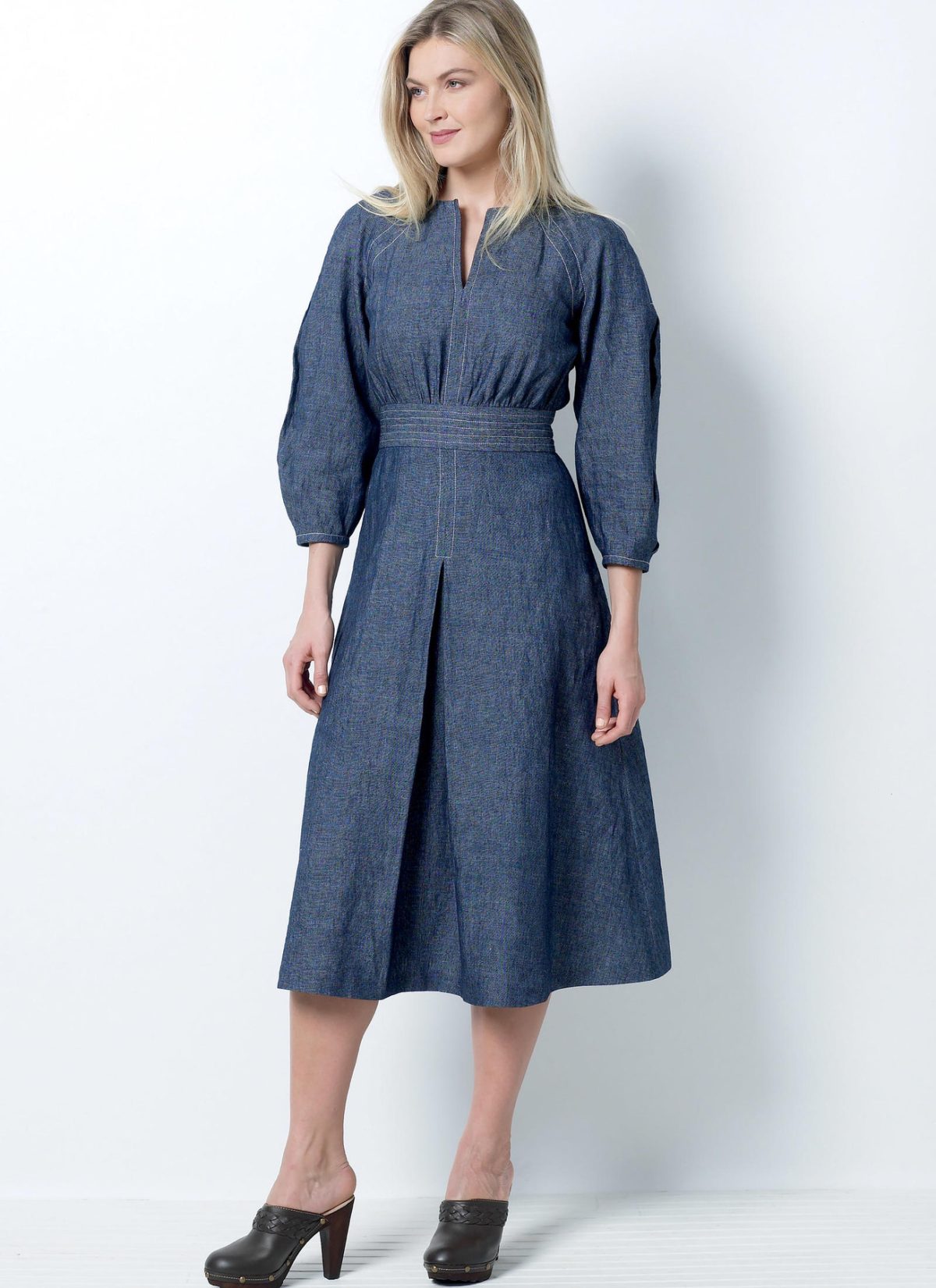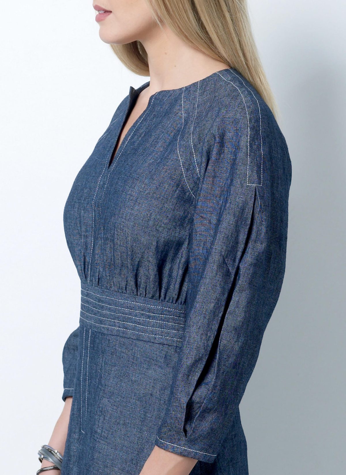 Fitted dress has raglan sleeves with tucks, inset waistband, contrast topstitching, and invisible side zipper.