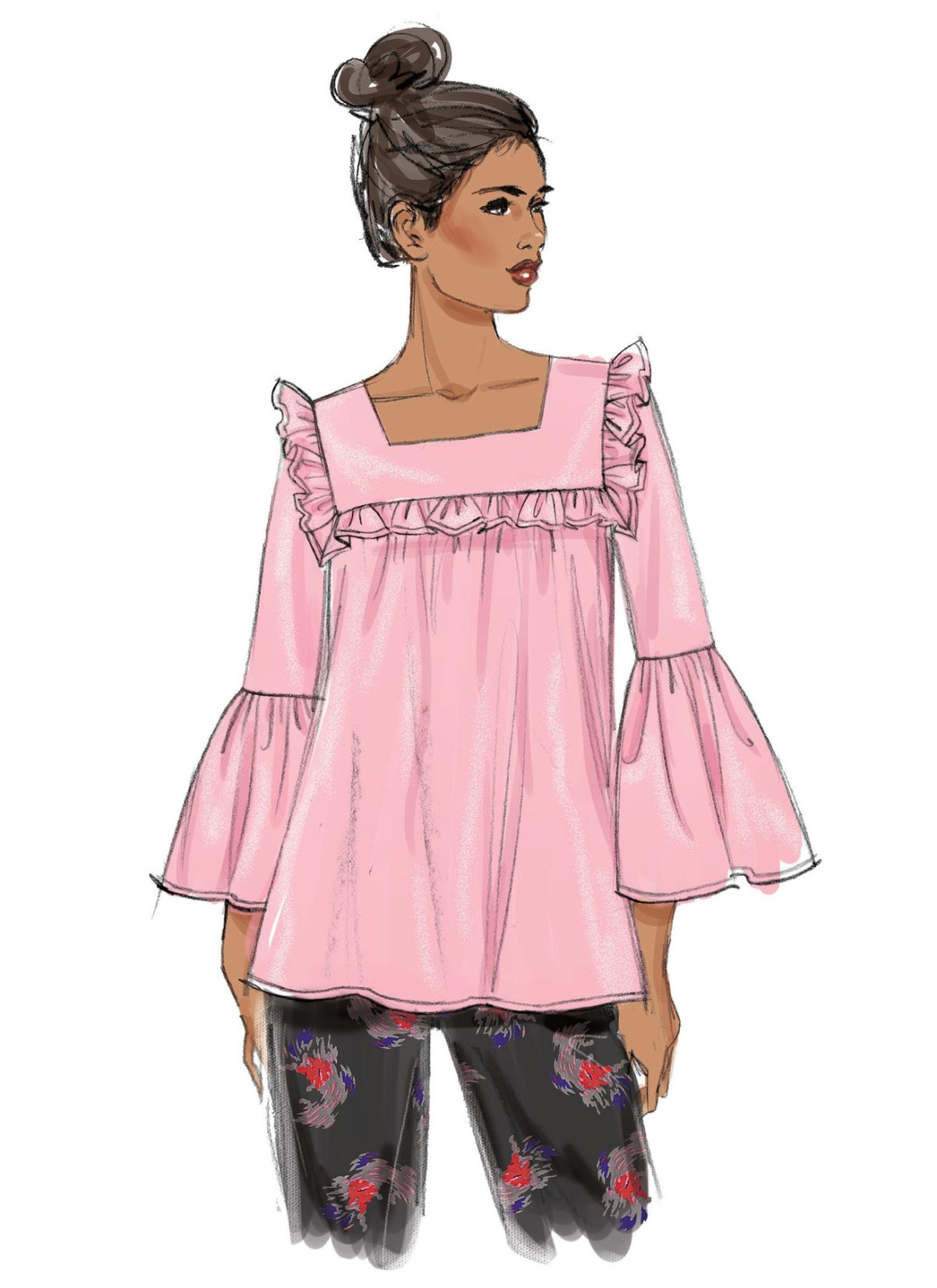 Very loose-fitting tops have front that gathers into yoke, back yoke with button closure, and sleeve variations. A: Contrast yoke and sleeve bands. C: Contrast lower sleeve. D: bust and shoulder ruffles