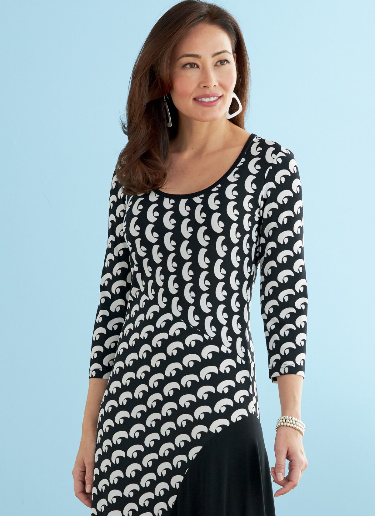 Misses’ asymmetric seamed dress, sleeveless and 3/4 sleeves. B: contrast side skirt.