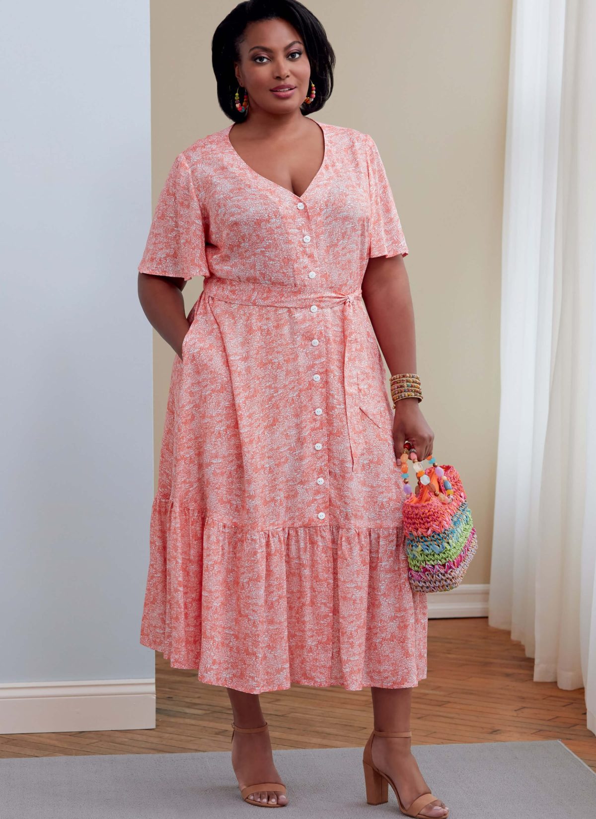 V-neck, button front dress with sleeve & skirt variations