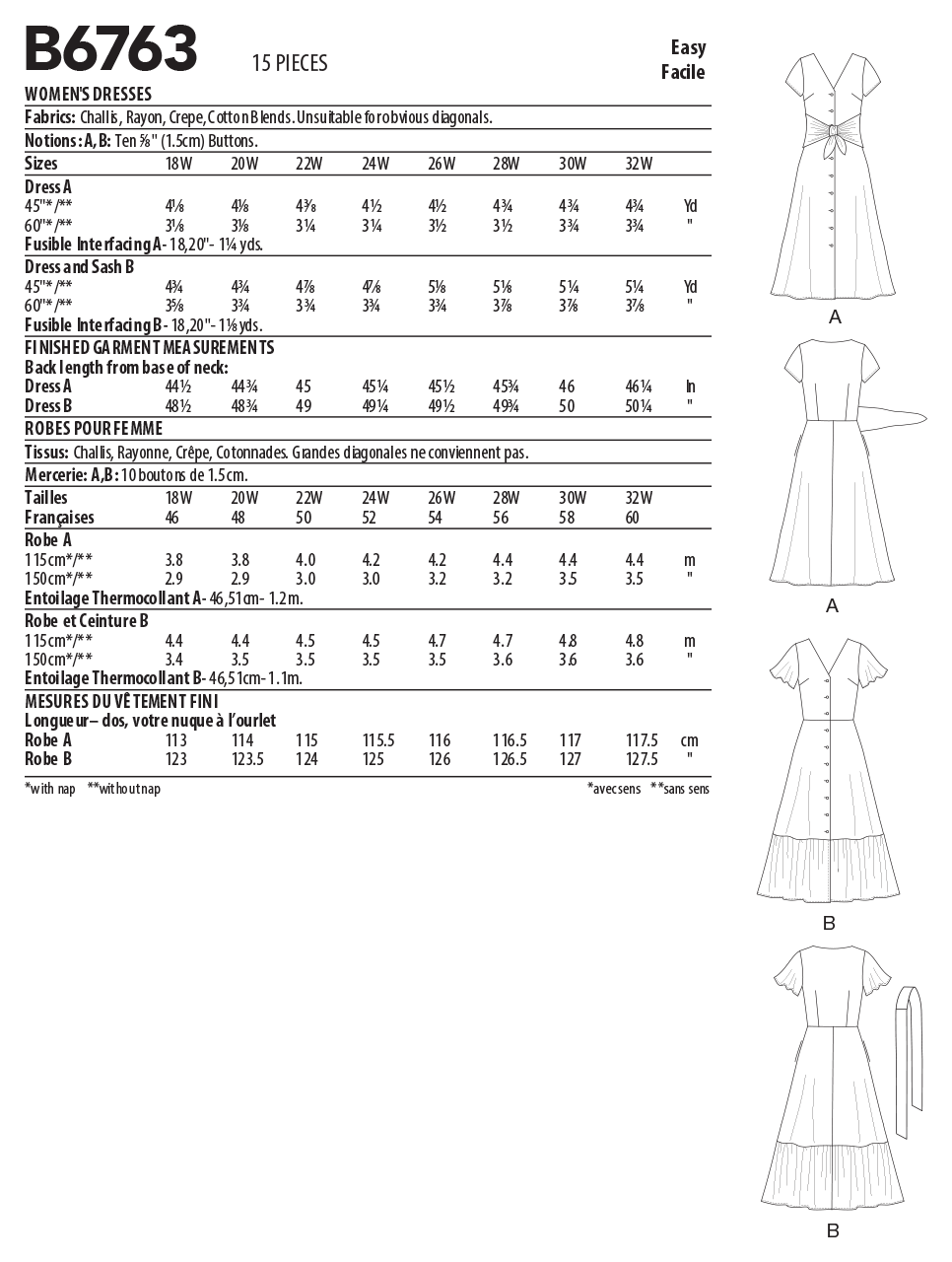 Unsuitable for obvious diagonals. *With Nap. **Without Nap.Challis, Rayon, Crepe, Cotton Blends.Note: Fabric requirement allows for nap, one-way design or shading. Extra fabric may be needed to match design or for shrinkage.