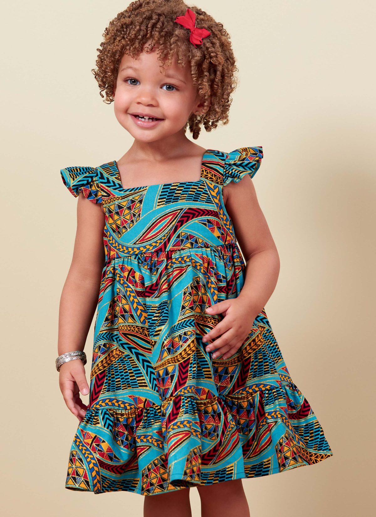 Toddler’s high-waist dress has full gathered skirt and shoulder straps, with and without ruffles. Sewing skill: Easy.