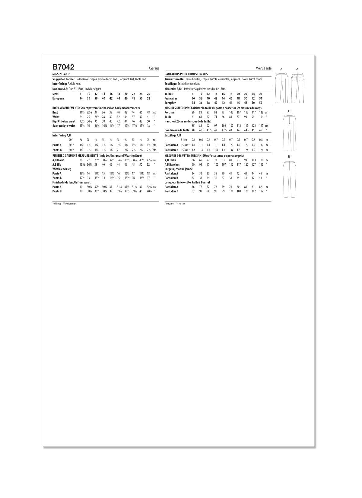 Fitted pants have curved waistband, front pin tucks and invisible zipper closure. View A pants have back pockets and side slits at leg. Make it an outfit with the matching jacket pattern B7026!