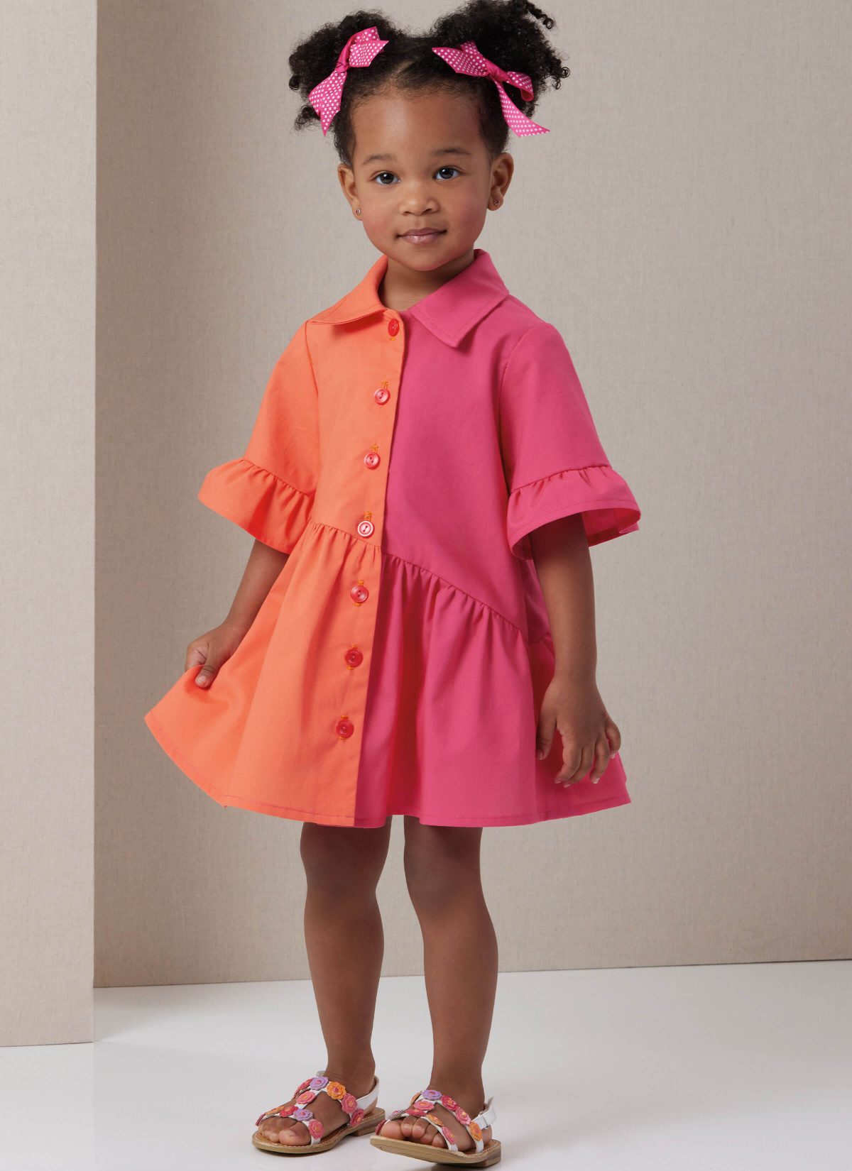 Toddlers’ button front dress with pointed or rounded collar has skirt gathers, contrasting fabrics and sleeve variations. Sleeve options include short sleeves, elbow length sleeves with ruffles and long sleeves.
