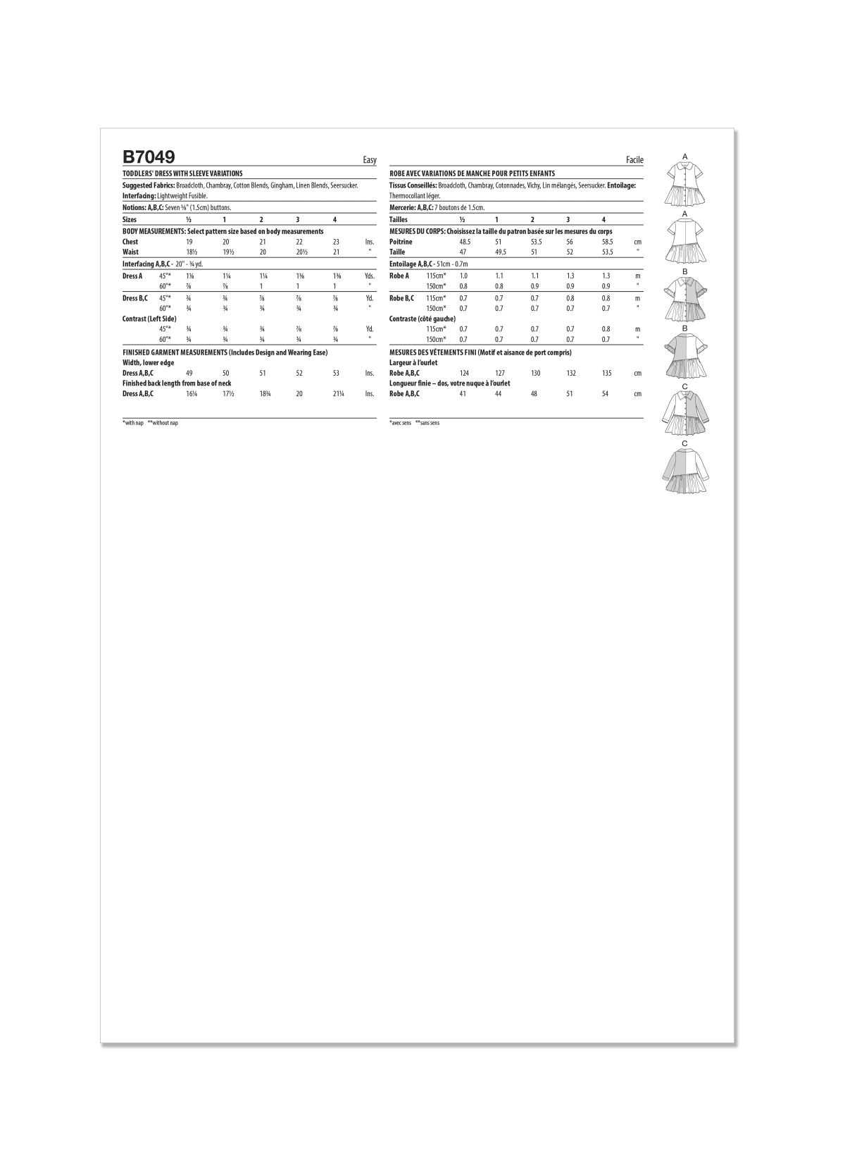 Butterick Sewing Pattern B7049 Toddlers’ Dress with Sleeve Variations