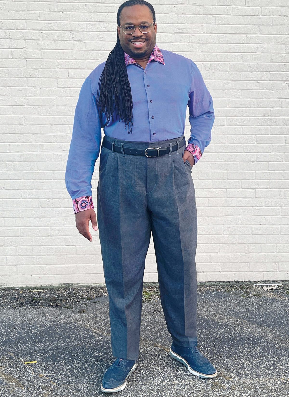 Sew Along to the new Know Me ME2018 View A with Julian in this step-by-step video. This Mens pattern is a button up shirt with contrast Italian collar has short or long sleeves with contrast cuffs. Pants include front pleats, slash pockets, single welt back pockets, and belt loops. Comes with straight or cuffed wide leg options.