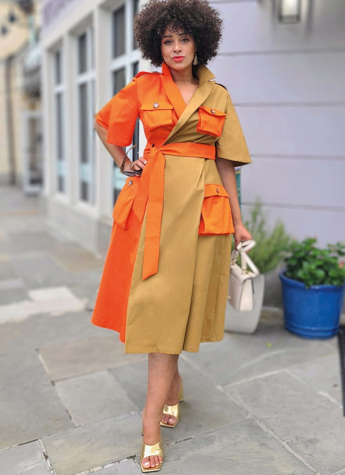 Sew Along to the new Know Me ME2020 with Marcia in this step-by-step video. This Misses pattern is a color block wrap dress in two lengths with shirt details and belt has wide notched collar, cargo pockets on sides and chest, inside ribbon ties and epaulettes with button closure. Dress has short sleeves or sleeveless option.