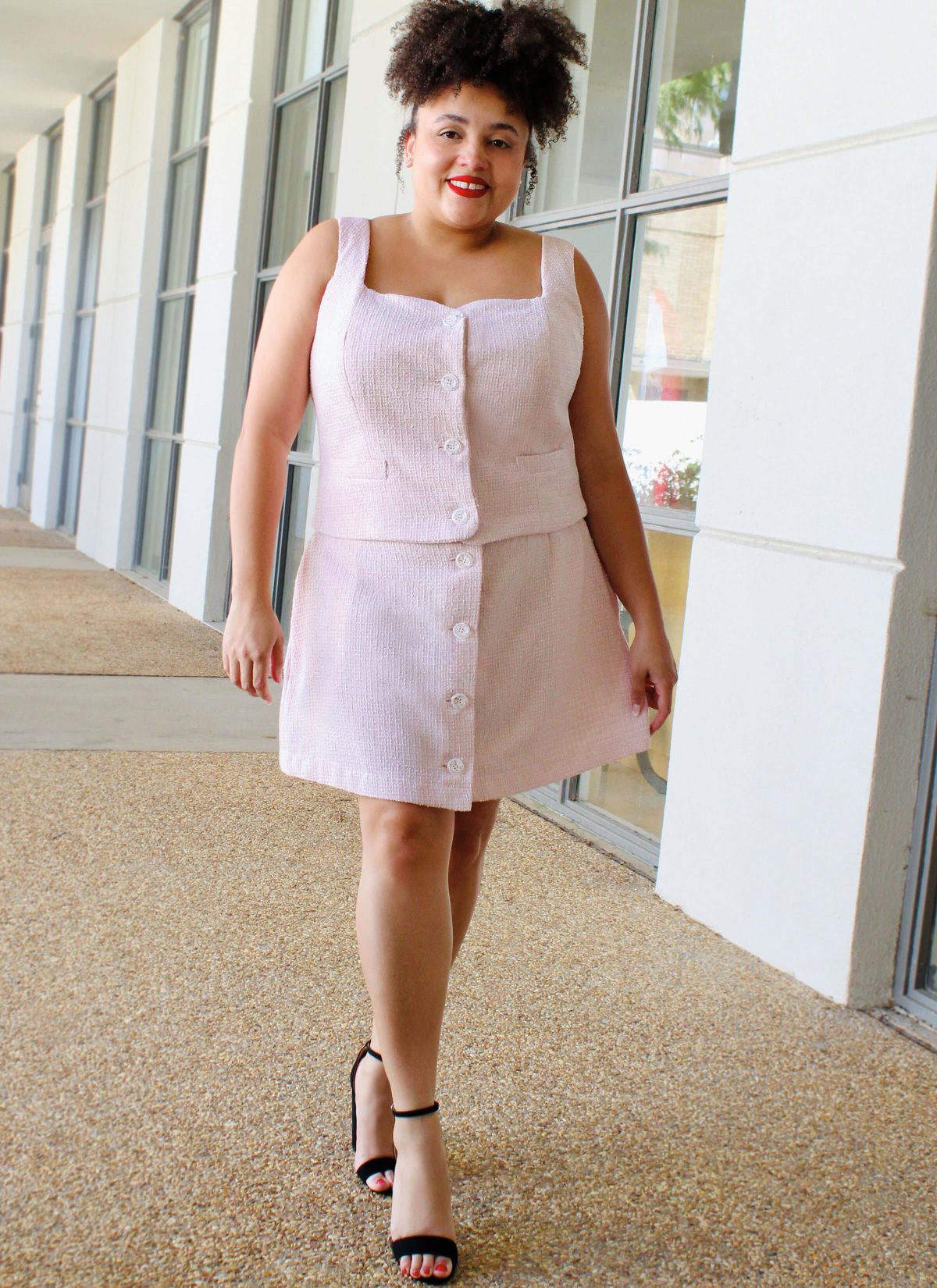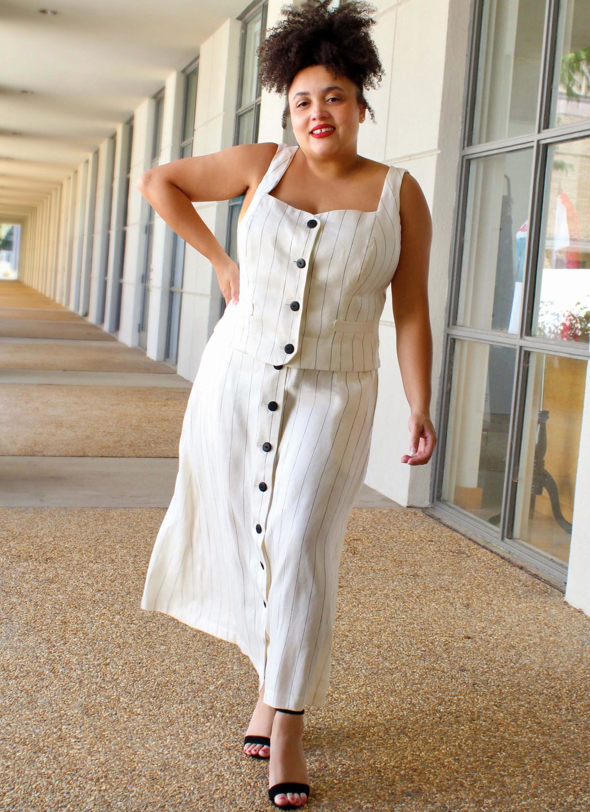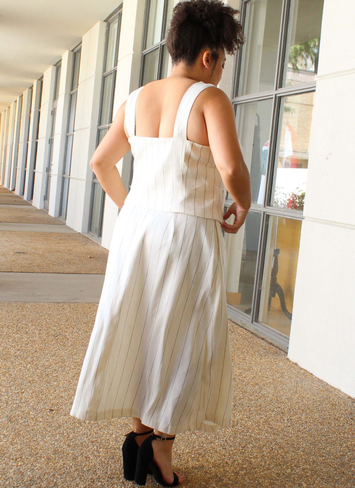 Sew Along to the new Know Me ME2107 View B & C with Raven Maureen (@)ravenmaureen_) in this step-by-step video. This Misses pattern features a fitted, coordinating top and skirt pattern set. Top with wide straps has sweetheart neckline, princess seams, front button closure and faux welt pockets. A-line skirts in mini or midi length have front button closure, back darts and side seam pockets. Separate pattern pieces for A/B, C, D cup sizes.