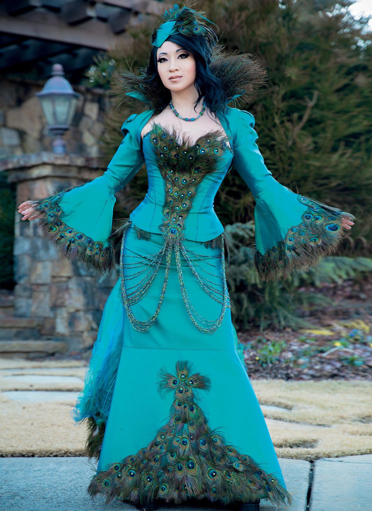 Partially lined, cropped jacket has standing, interfaced collar with stay and wire, gathered sleeve cap and flounce. Close-fitting, interfaced, lined, boned corset has sweetheart neckline, seam detail, and purchased ribbon for back lacing and trim. Semi-fitted, floor-length skirt has waistband, mermaid flounce, invisible back zipper and shaped hemline, wrong side shows. Detachable (snaps), lined train has band and underlay. Belt has hook & eye closure. D, E: Purchased beads. Self-lined, interfaced hat has top, bias, pleated sides. All have purchased peacock feathers.