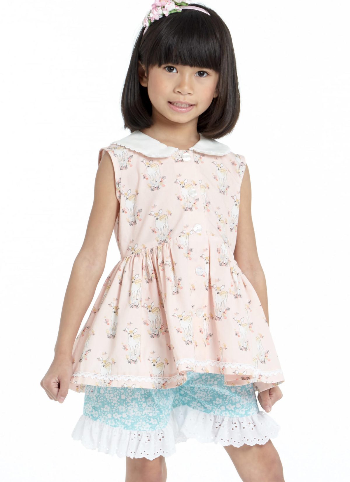 Button-front dress and top have skirt gathered into bodice. Pull on shorts have elastic at waist. A: Contrast collar. B: Contrast collar and pockets. Matching 18″ doll dress.