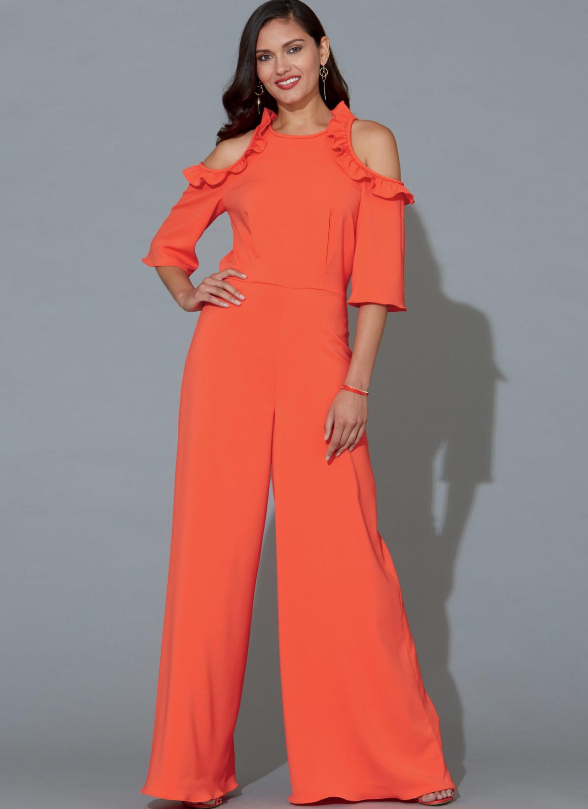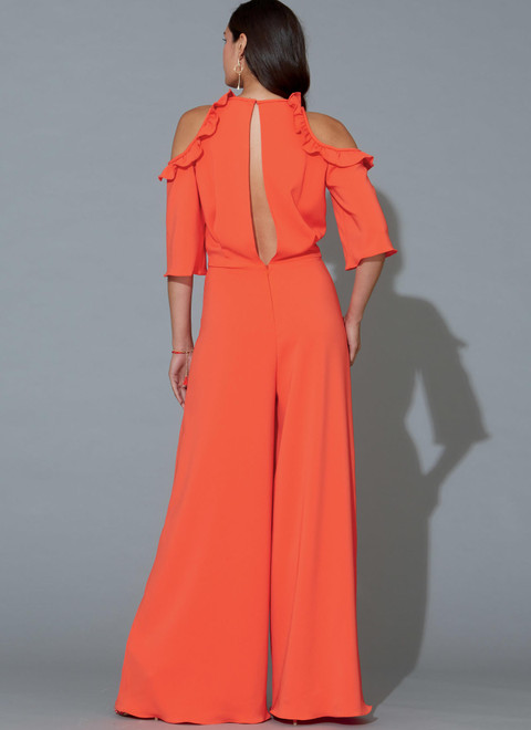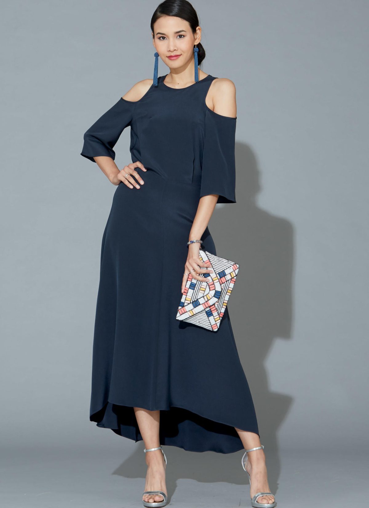 Dresses are fitted through the bust and have cold shoulder detail and length variations. B, C: Shaped hemline, wrong side of fabric will show. Jumpsuit is fitted through the bust and has floor length Trousers. All views have back invisible zipper closure.