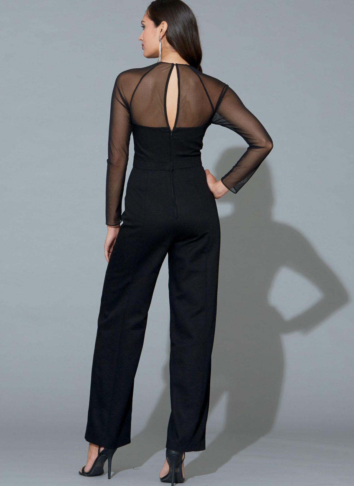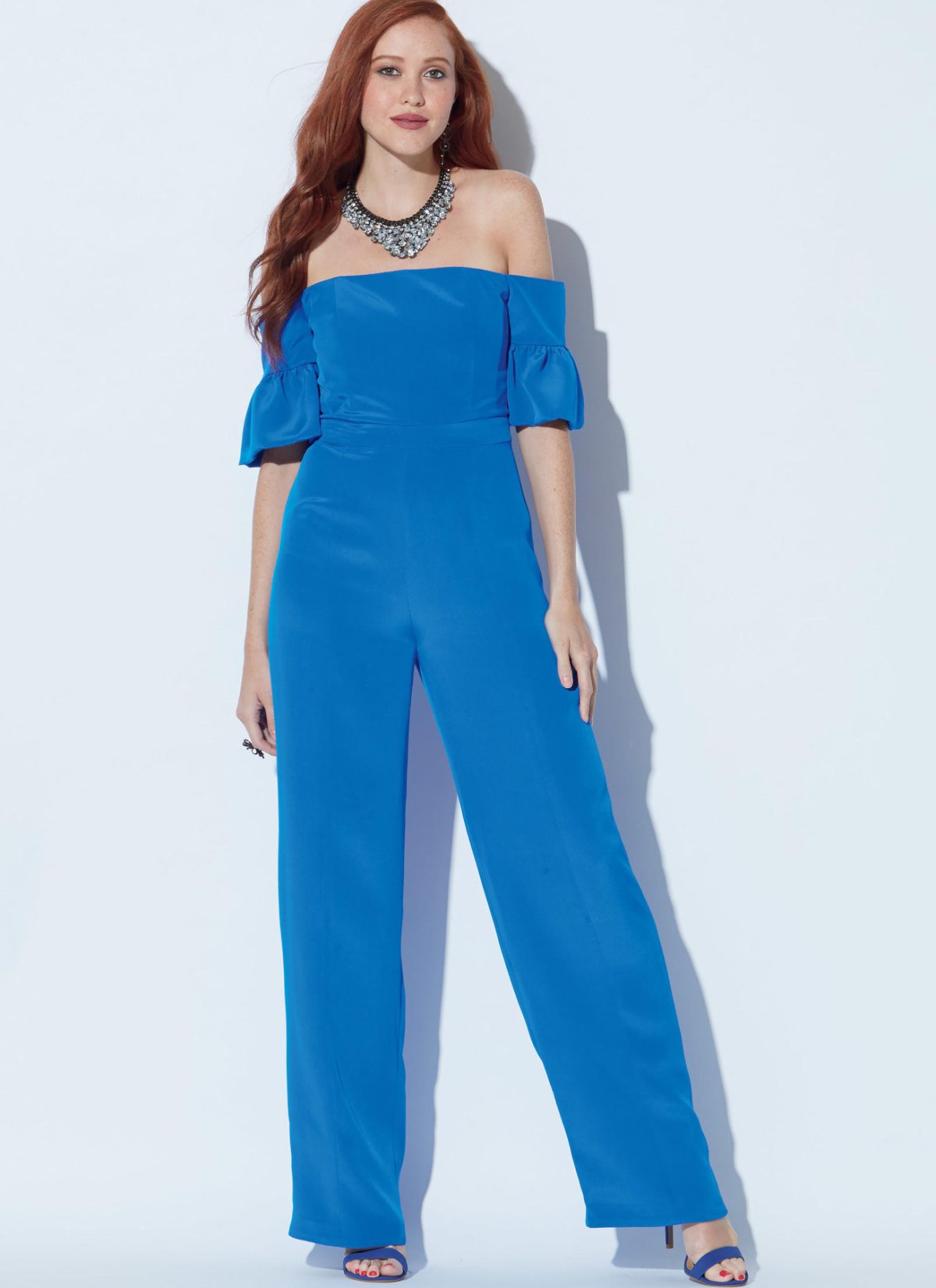 Jumpsuits, fitted through the bust, have lined bodice, neckline and sleeve variations, back zipper and ankle length Trousers. A: Straps cut from purchased trim. B: Contrast yokes and sleeves, back slit. C, D: Off the shoulder neckline.