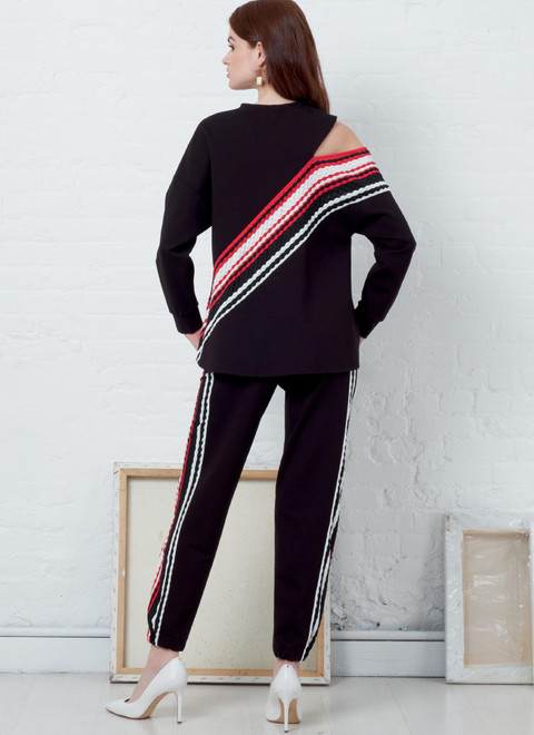 Loose-fitting knit tops feature sleeve, length and fabric variations and cold shoulder detail. Close-fitting pull-on Trousers have elasticated waist and leg openings, contrast side panels with no side seams, and side front pockets. Note: No provisions provided for above waist adjustment.