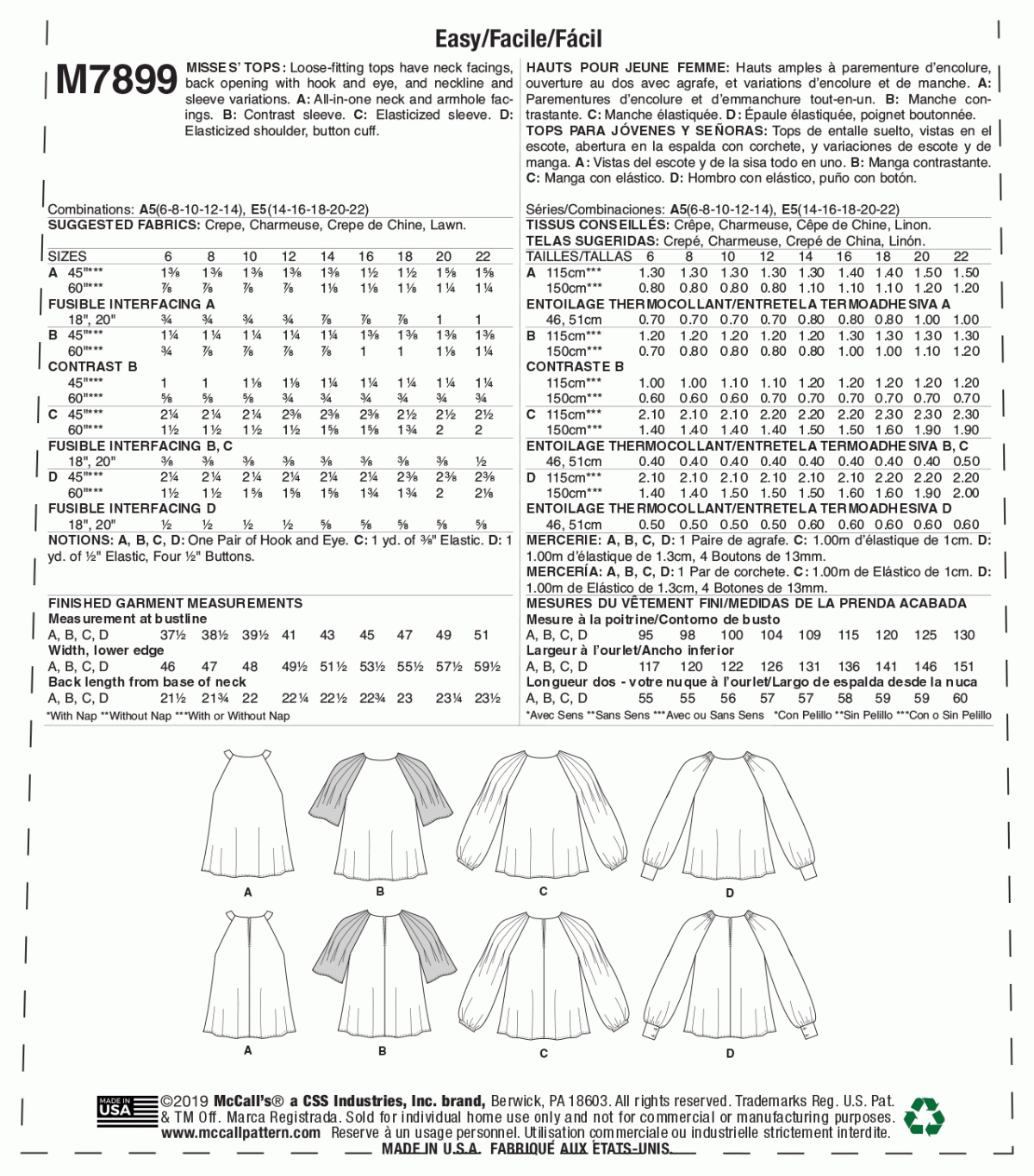 McCall’s Sewing Pattern M7899 Misses’ Tops