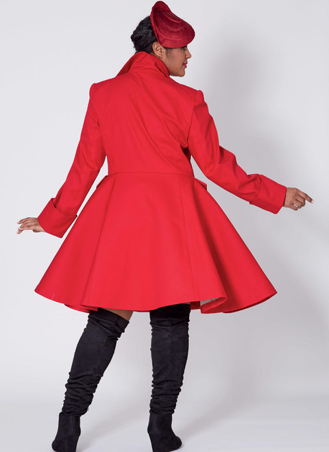 Fitted and flared, interfaced, lined coats have lapel variations, shoulder pads, pockets, and two-piece sleeves. A: Cuffs on Sleeves B: Back ruffle with lacing. Note: Separate pattern pieces are included for cup sizes C/D, DD, DDD.