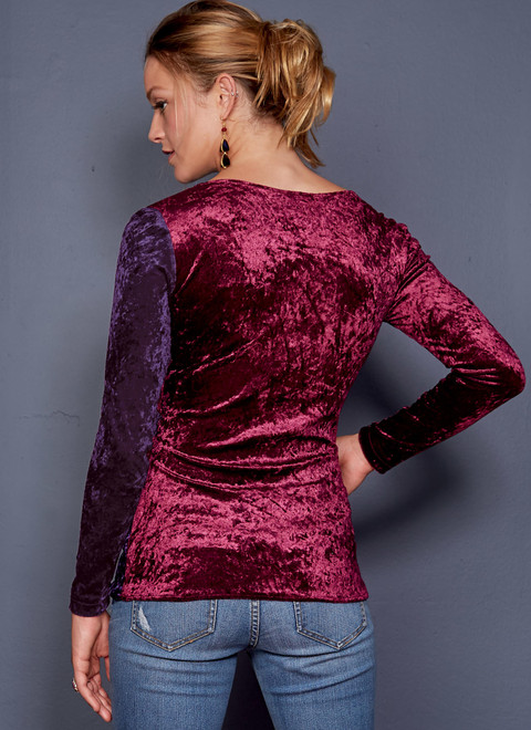 Close-fitting, pullover tops have wrap front with left side gathers, sleeve variations and narrow hems. C: Contrast left front and left sleeve. No provisions for adjustments above and below waist.