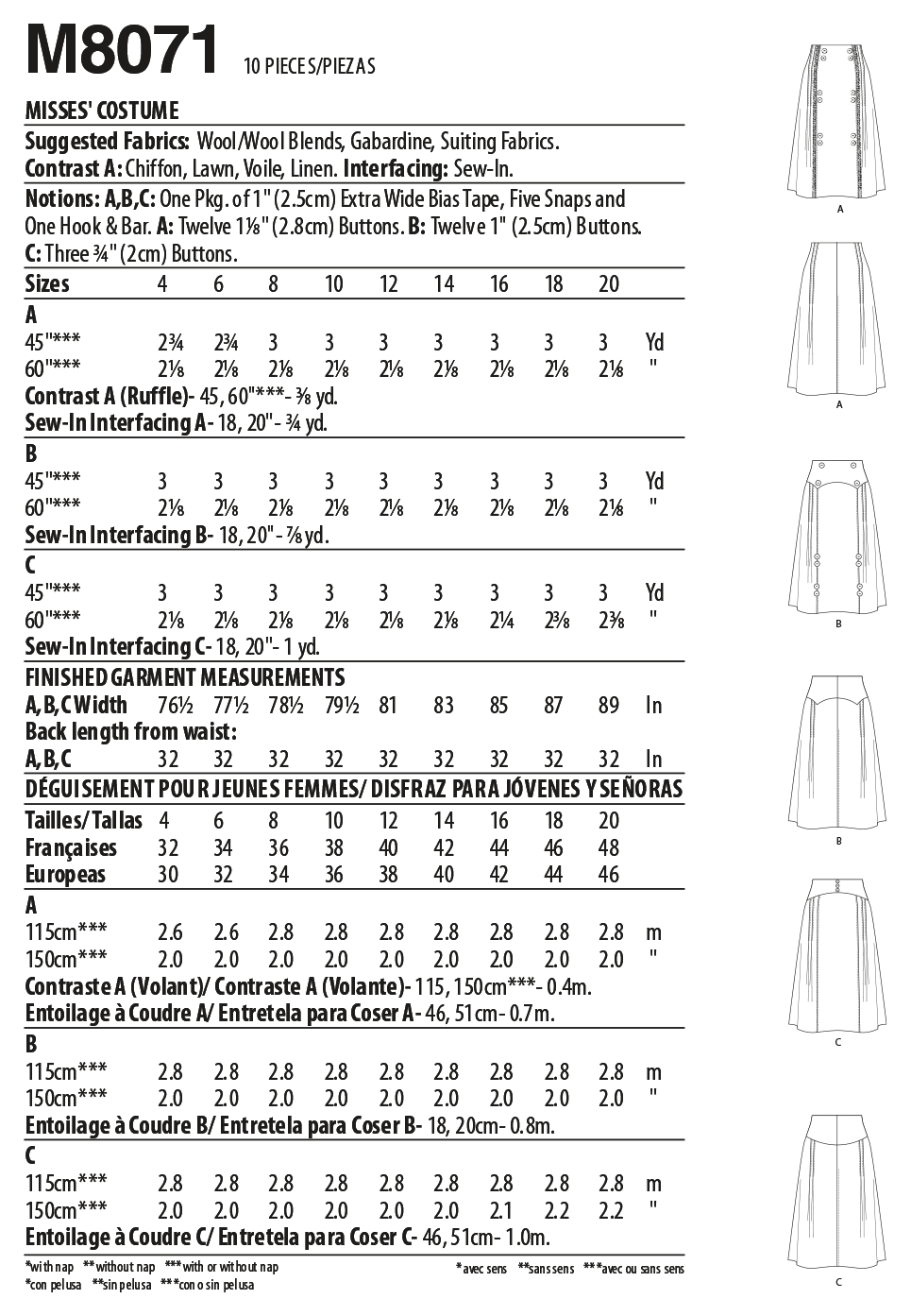 Wool/Wool Blends, Gabardine, Suiting Fabrics. Contrast A: Chiffon, Lawn, Voile, Linen. Interfacing: Sew-In. Note: Fabric requirement allows for nap, one-way design or shading. Extra fabric may be needed to match design or for shrinkage.