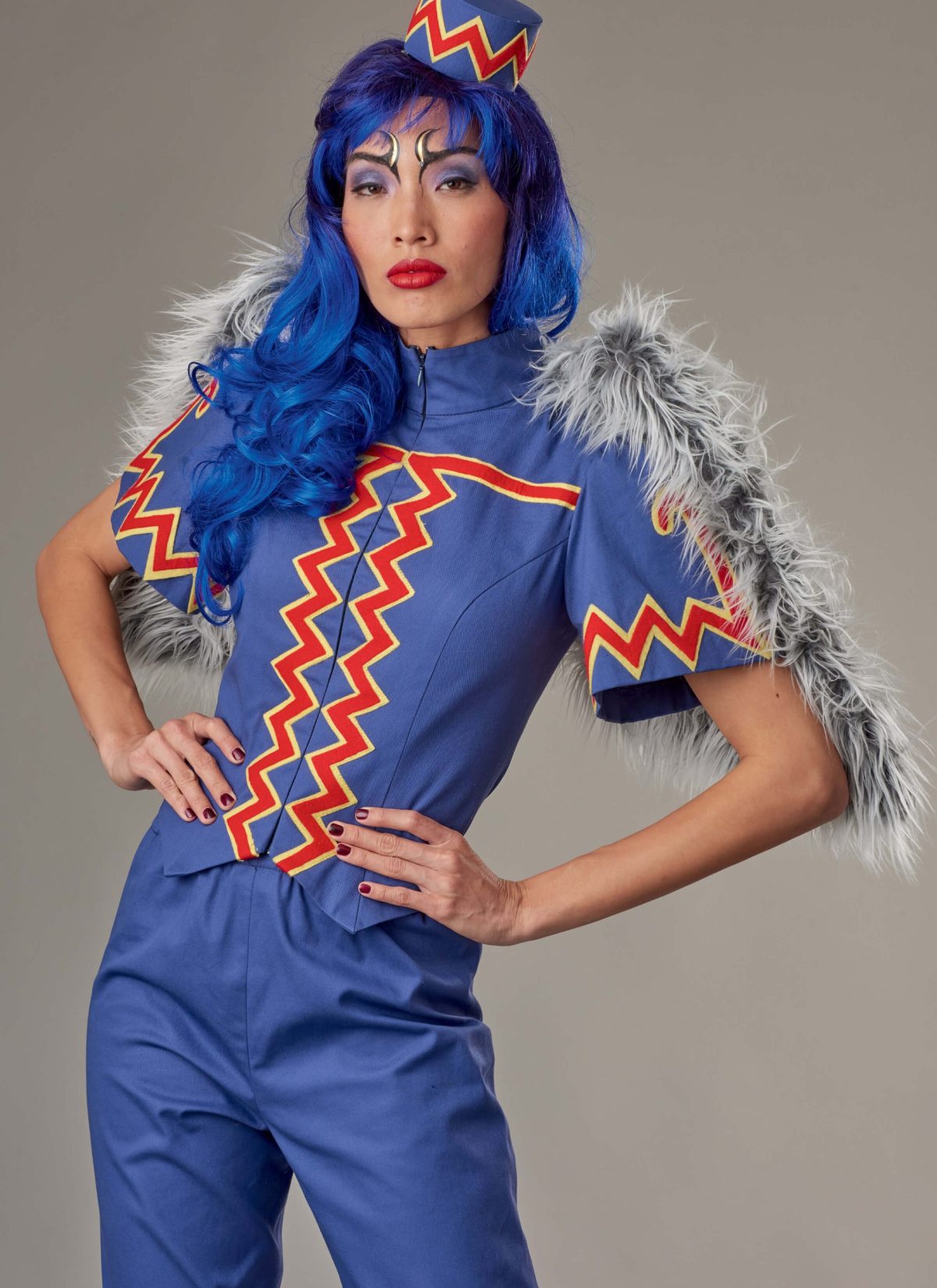 Misses’ playful costume includes a fitted high collar top with short bell sleeves and fun trim details. Wings are a fun addition. Easy bloomers and easy cowl.