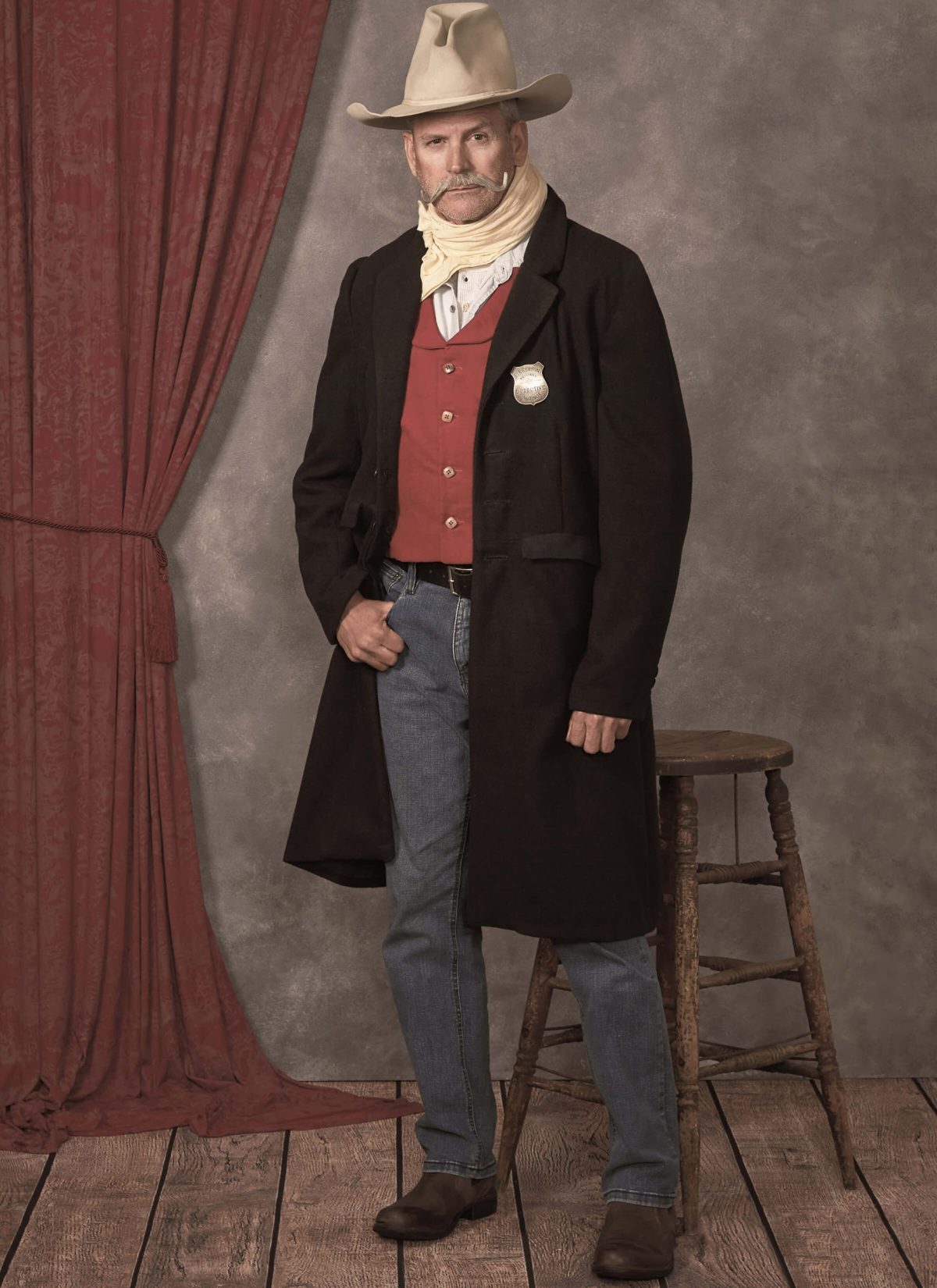 Long coat has back seam with walking and riding vent. Flapped pockets in waist seam. Shawl collar, front-buttoned waistcoat with back ties. Coat and waistcoat are lined. Large bandana. Sew Rating: Average.