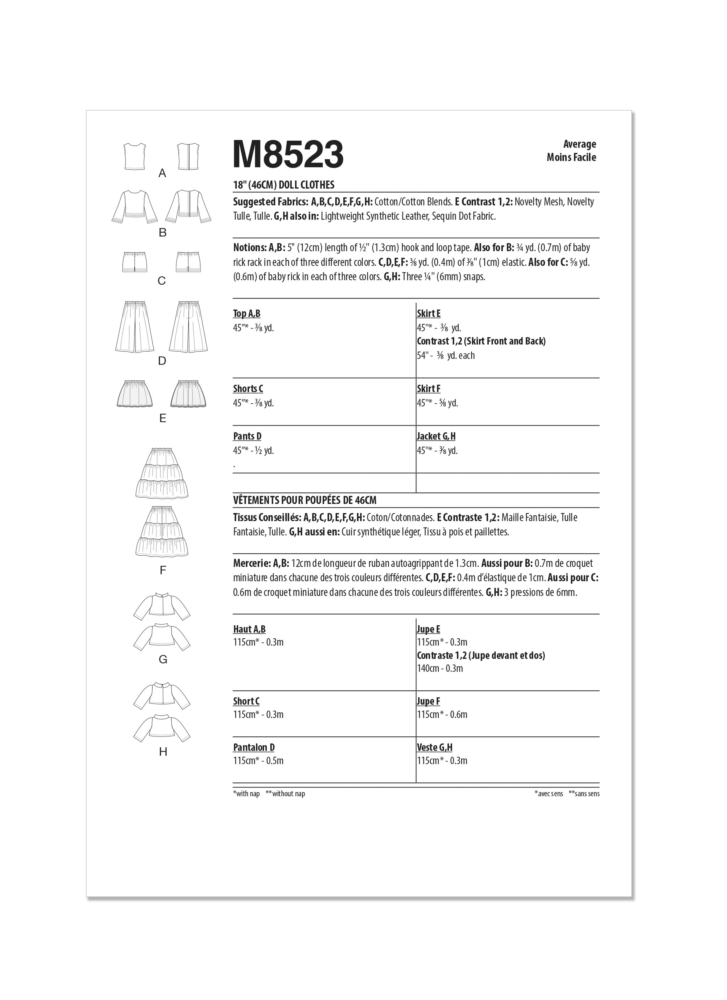 18″ Doll clothes separates. Both tops A and B have neck facings and hook and loop tape closure. The long sleeve top and coordinating shorts have rick rack trim. Jackets G and H have set in sleeves. The shorts, trousers, skirt and tiered skirt pull on with elastic at the waist. Unlined jackets have snap front closure. View H has a fold down collar with decorative stitching and view G has a stand collar.