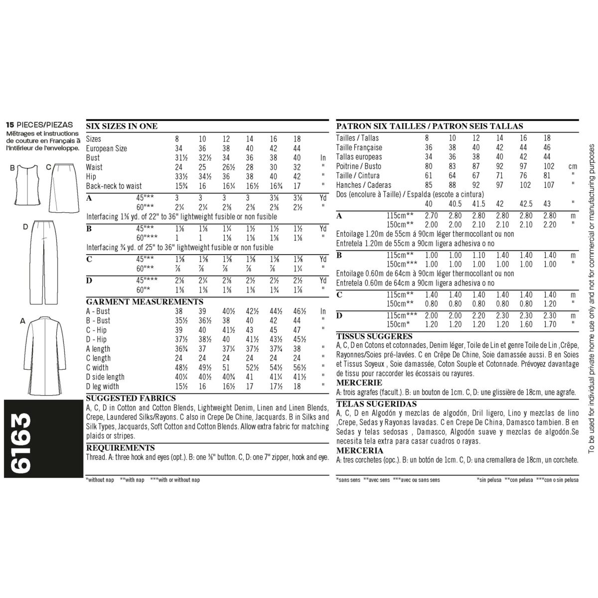 A,C,D in cotton and Cotton Blends, Lightweight Denim, Linen and Linen Blends, Crepe, Laundered Silks/Rayons. C also in Crepe de Chine, Jacquards, Soft Cotton ande Cotton Blends.