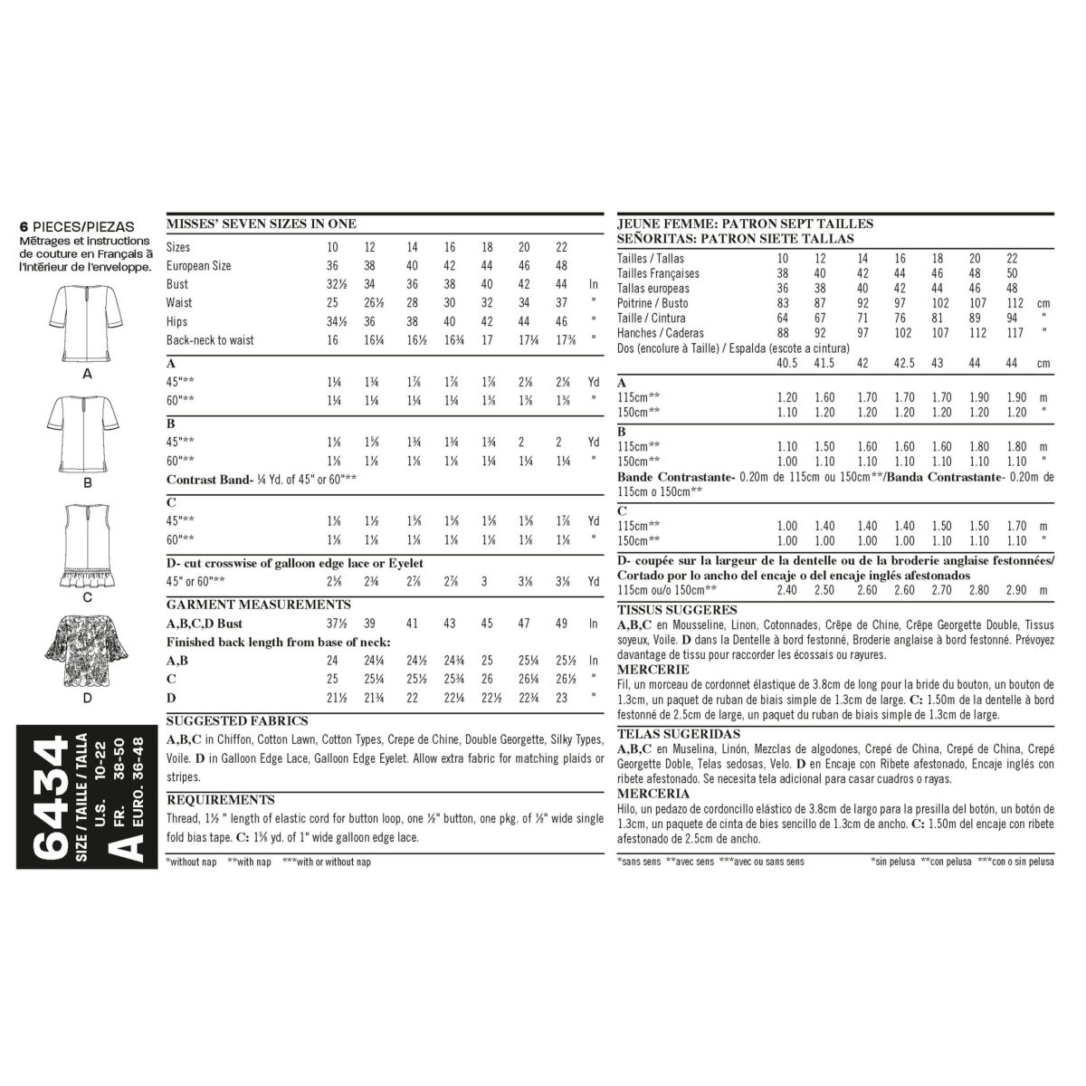 A,B,C in Chiffon, Cotton Lawn, Cotton Types, Crepe de Chine, Double Georgette, Silky types, Voile. D in Galloon Edge Lace, Galloon Edge Eyelet.