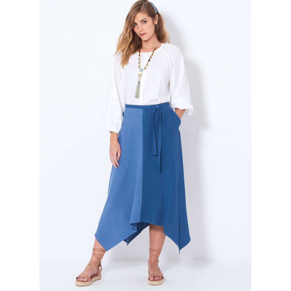 Bias cut asymmetrical skirts with handkerchief hem start below knee, end at mid-calf. Can be made in single or contrast fabrics. Shorter view has straight hem and falls above the knee. Tie belt can be self or contrast. Sewing skill: Average.