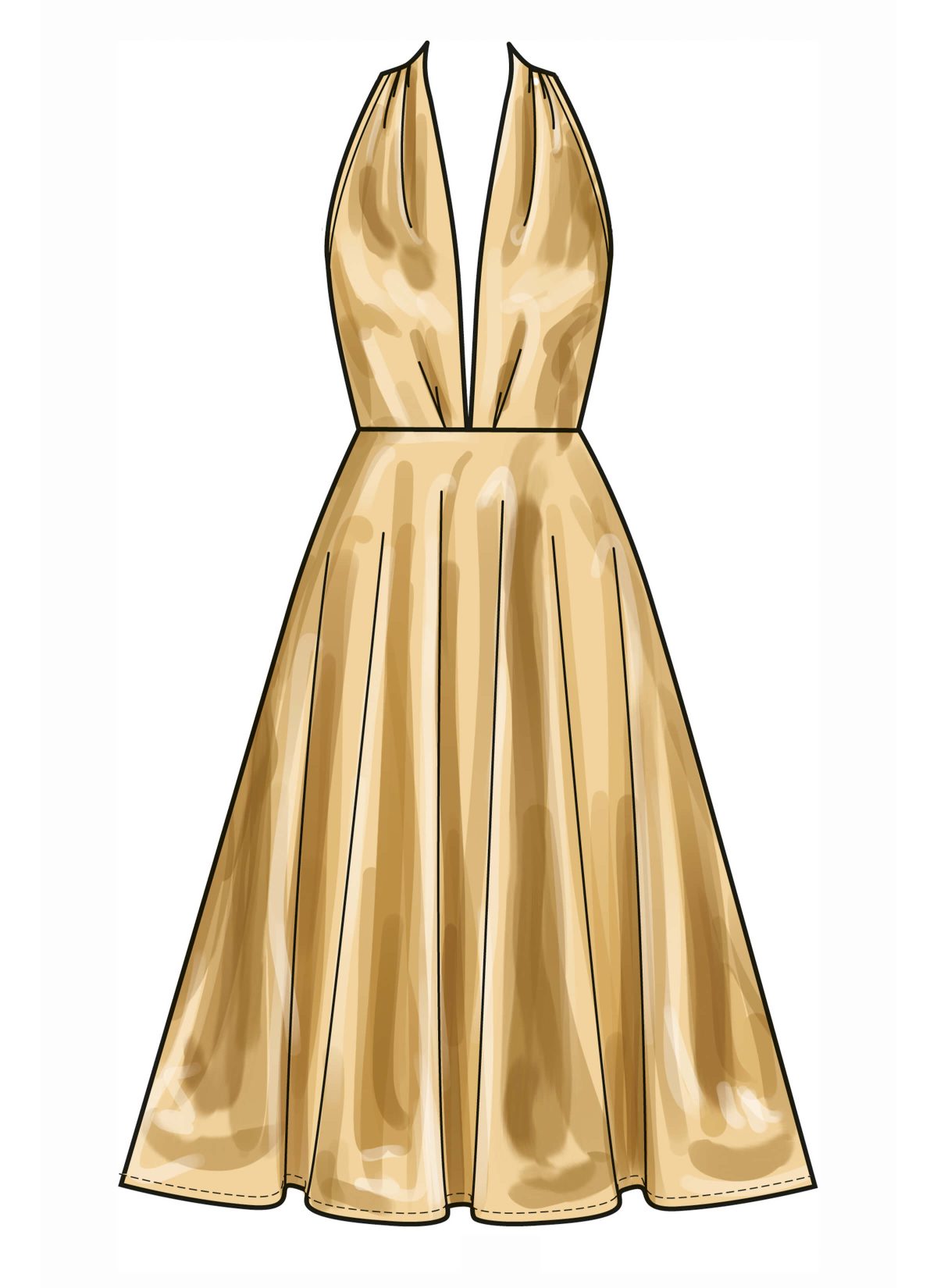 Fitted, unlined dress with length variations has pleated bodice, circle skirt with stitched hem and pockets, back zipper and hook and eye closure. Purchased bias tape finishes armholes.
