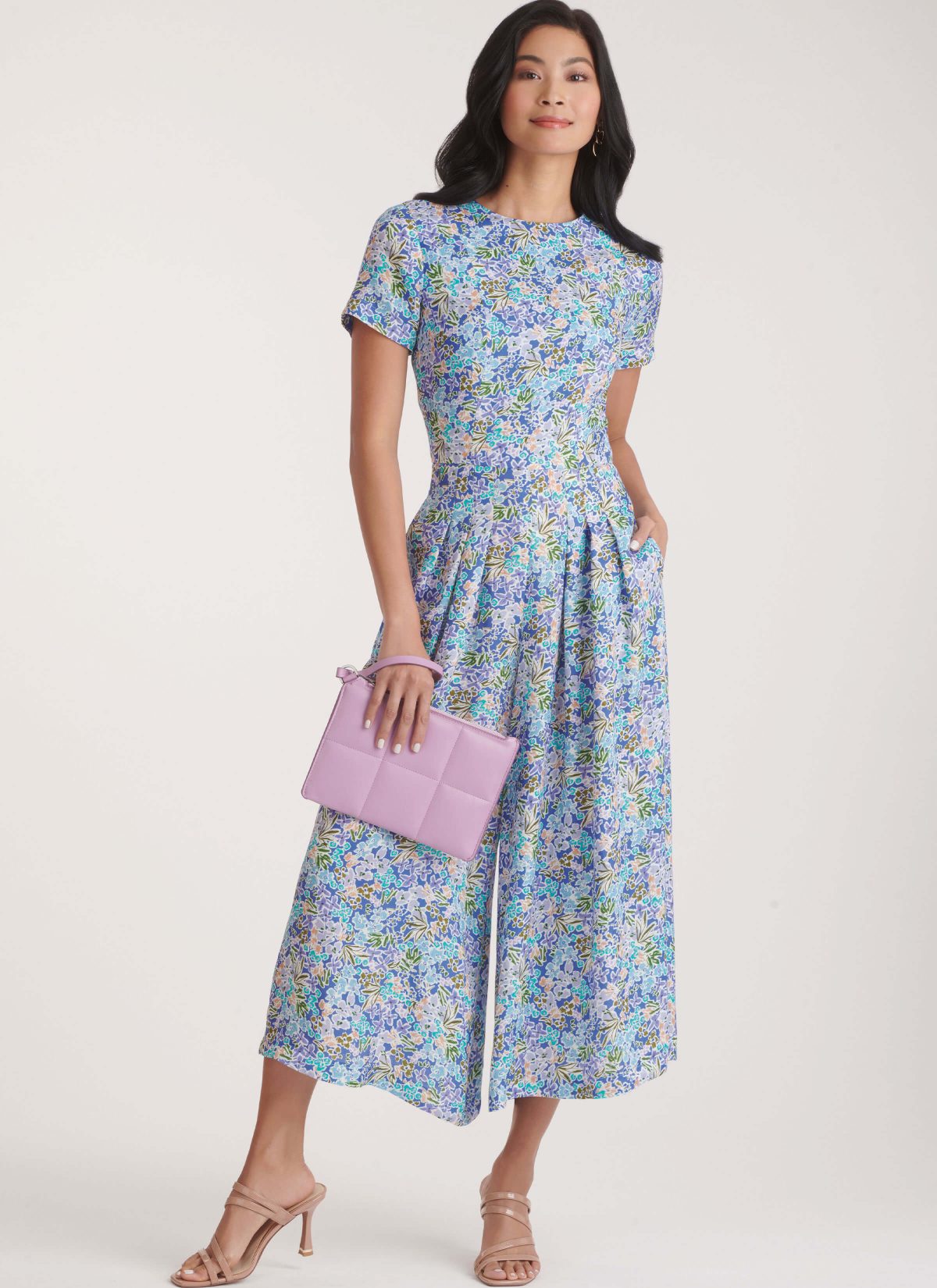 Dress and jumpsuit have close-fitting, lined bodice with princess seams, round neckline, side pockets, stitched hem, and back zipper. View A: Sleeveless dress with gathered skirt. View B: Jumpsuit, cropped wide leg, short sleeves.