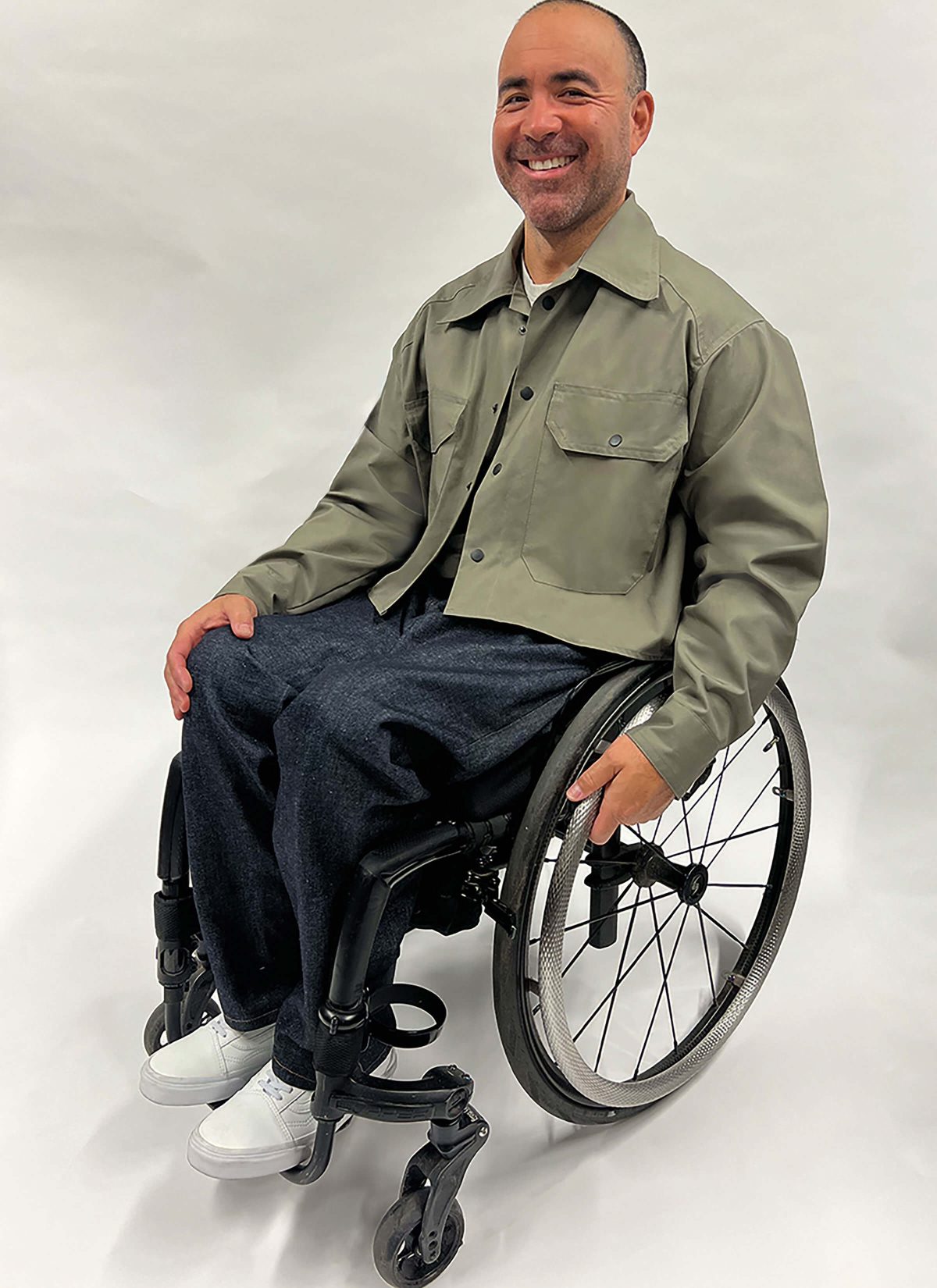 Roomy shacket has front and back yokes, front patch pockets with flaps, long sleeves with cuffs and front closure. Closure options for front, pockets and sleeve cuffs include buttons with buttonholes, snaps or magnets, depending on individual needs. Shaped and shortened front hem option is designed for wheelchair users, eliminating extra fabric while seated. See envelope for more information.