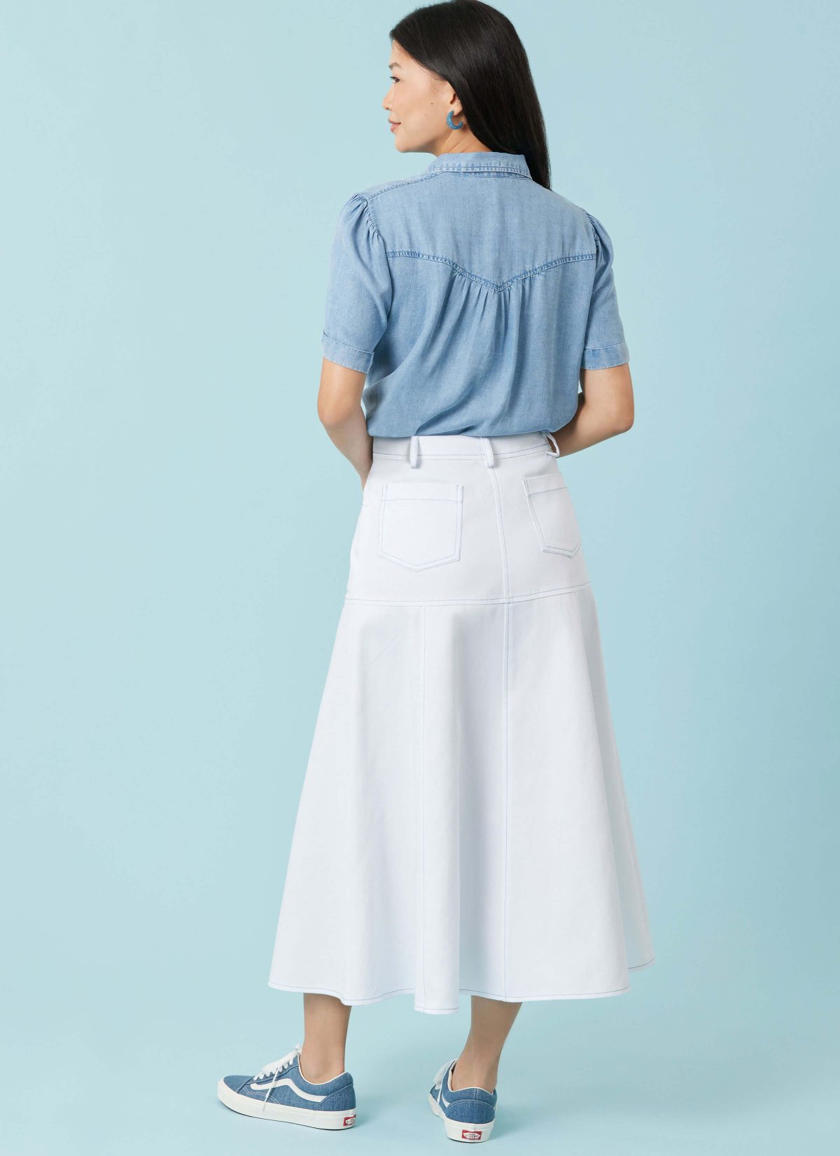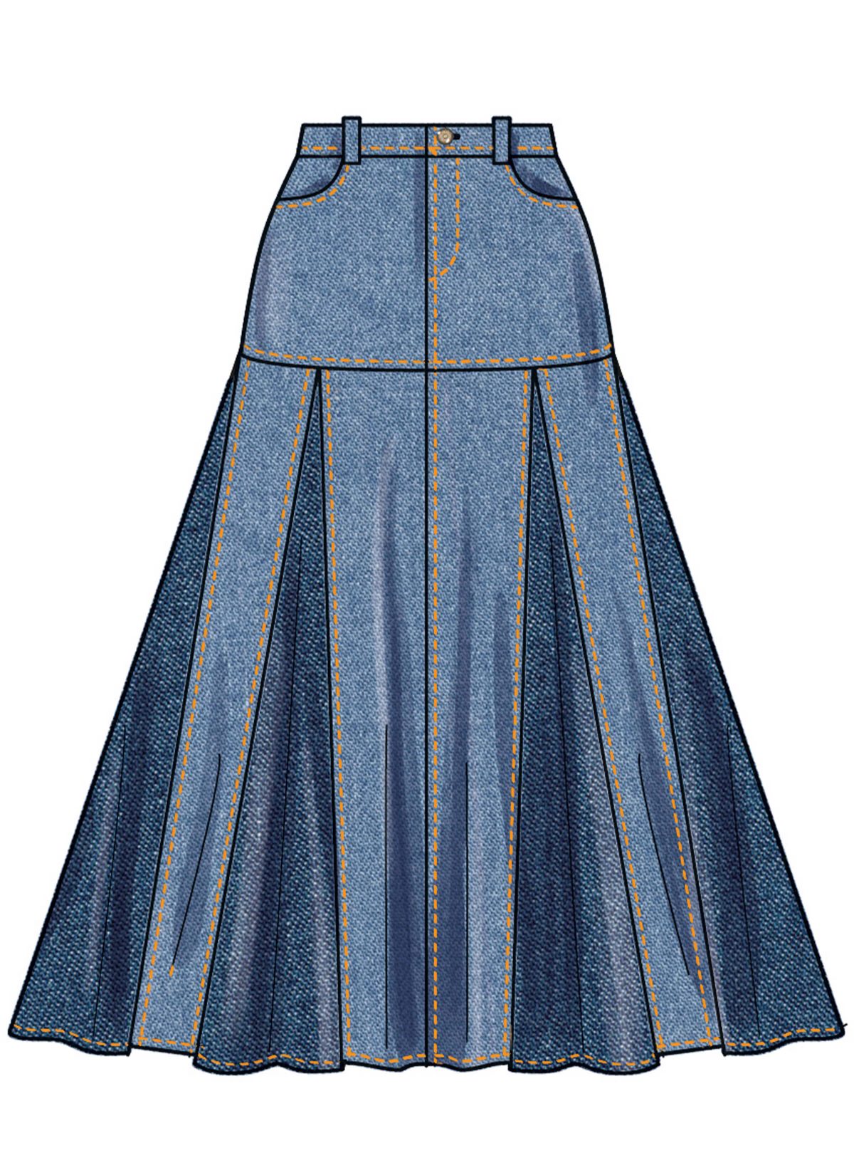 Flared skirts in two lengths have waistband with belt loops, front fly zipper with button closure, front pockets and top stitching details. View C skirt has contrast godets.