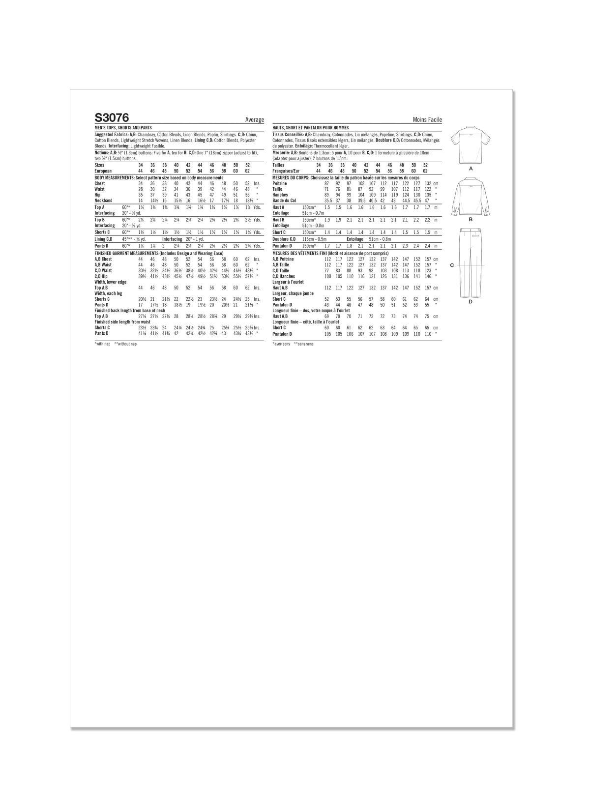 Simplicity Sewing Pattern S3076 Men’s Tops, Shorts and Trousers