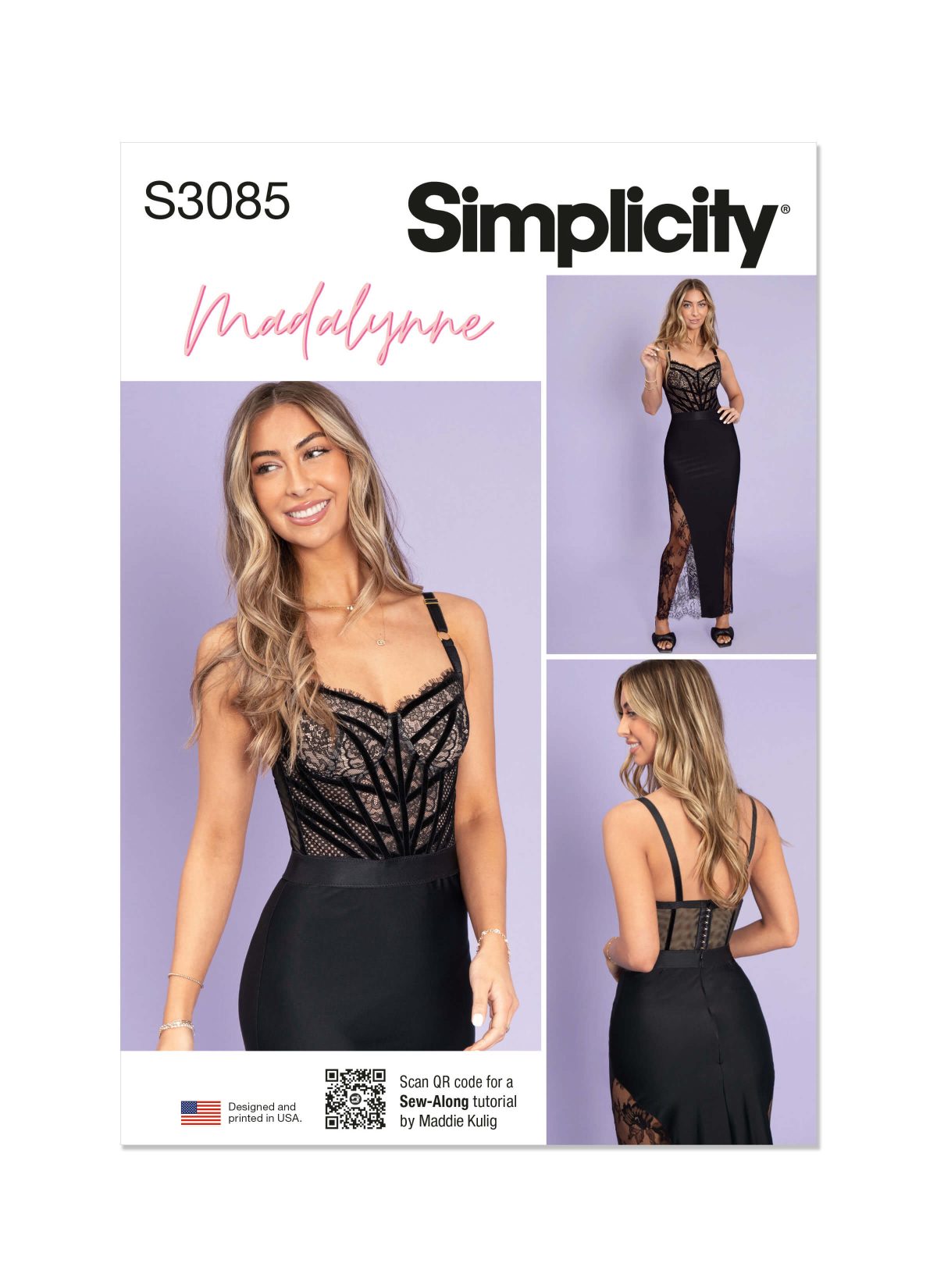 Watch Part 1 of Madalynne X Simplicity S3085. This Misses and Women's pattern features a dress with corseted bodice has knit back, wide elastic waistband and knit full length skirt with contrast lace fabric godets. Lingerie-constructed bodice has boning, foam-lined bust cups with underwires, contrast lace panels and bust cups and velvet band trim accents. Knit banding finishes the back and under arm sections, extending into adjustable straps with bra slides and rings. Dress closes with back invisible zipper and hook and eye tape. Includes bust cups ranging from A to J cups.