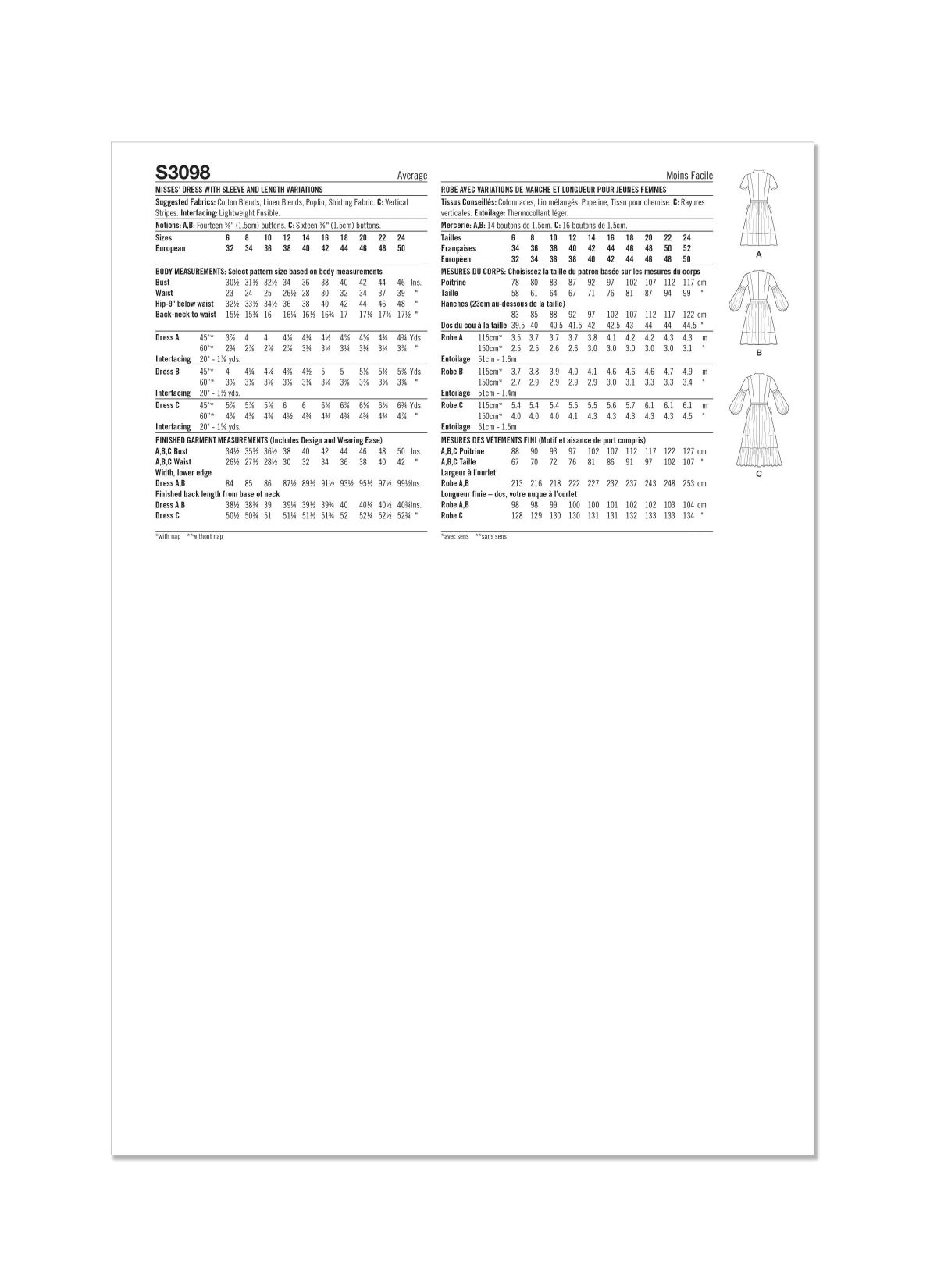 Simplicity Sewing Pattern S3098 Misses’ Dress with Sleeve & Length Options