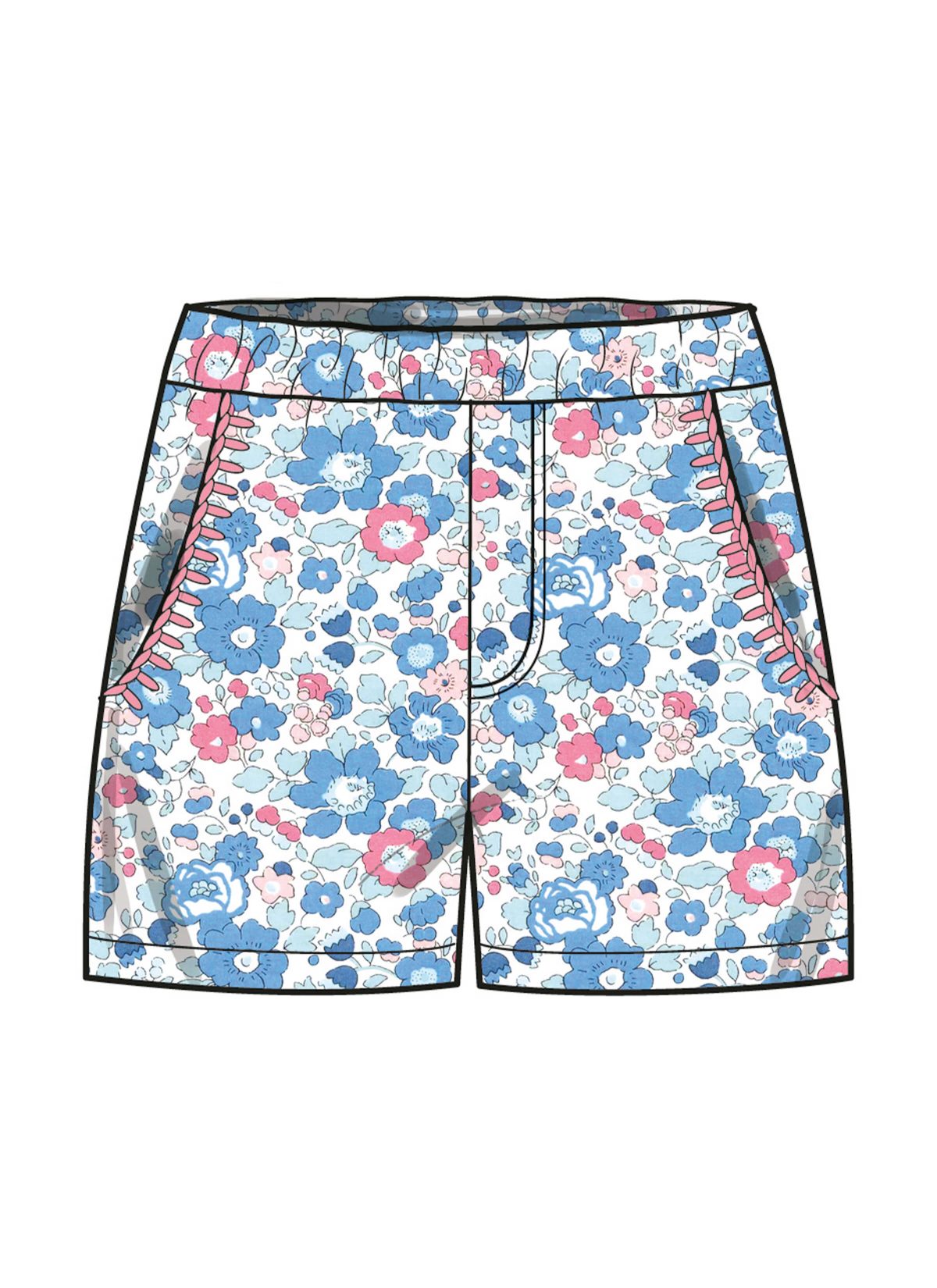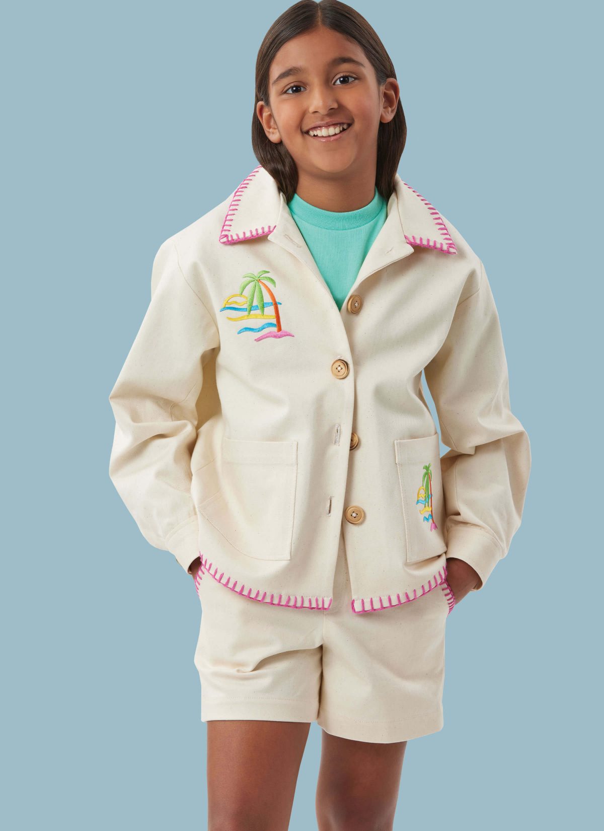 Stylish jacket with front button opening has dropped shoulders, front patch pockets, back yoke, and back box pleat. Collar and hem have yarn or floss stitching detail. Pull-on shorts and trousers have elastic waistband, faux front fly and pockets with yarn or floss stitching detail. Optional purchased appliques. Purchase sizes separately.