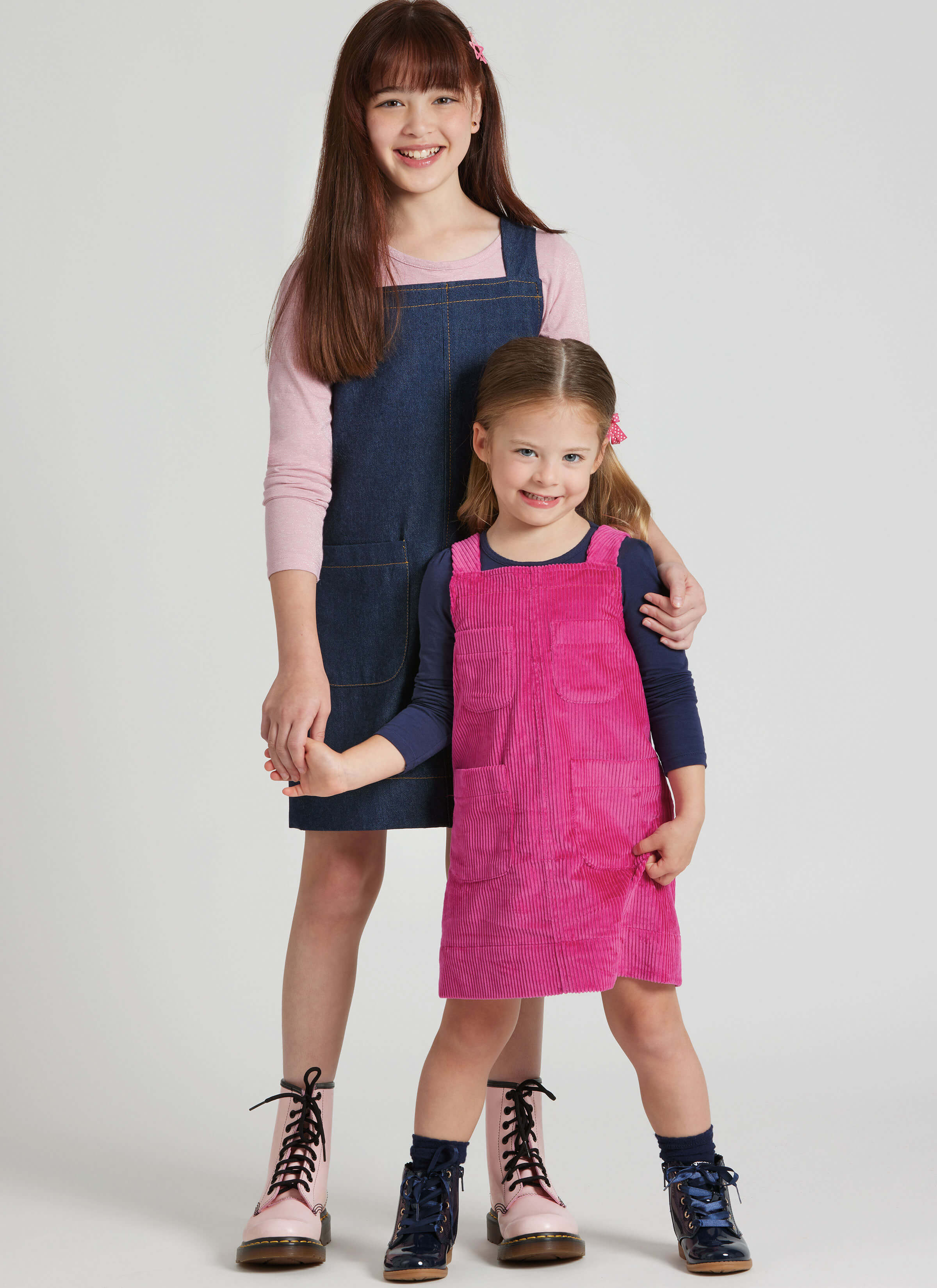 Children’s and Girls Jumpers A and B have front hip patch pockets and shoulder straps. View B has contrast. View C has front chest patch pockets, hip patch pockets and shoulder straps.