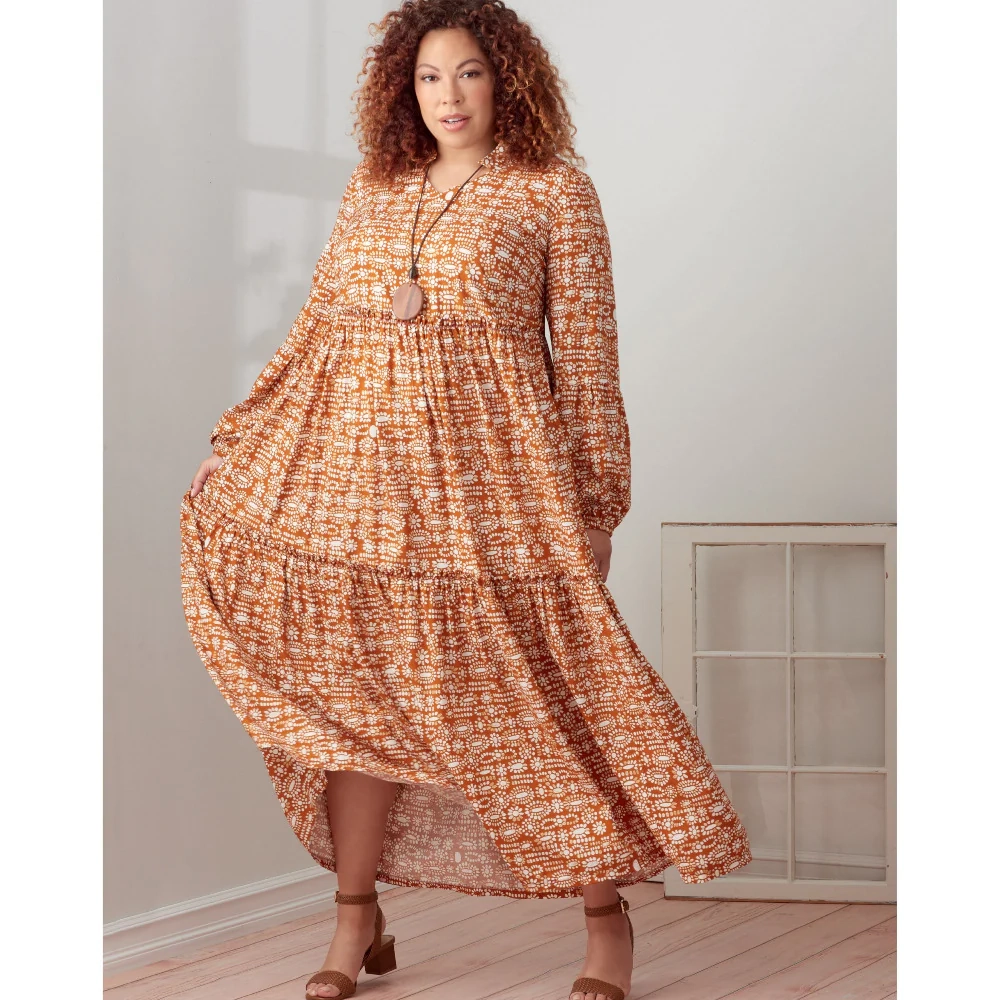 Misses’ and women’s tiered dresses. Midi and maxi lengths and sleeve variations.